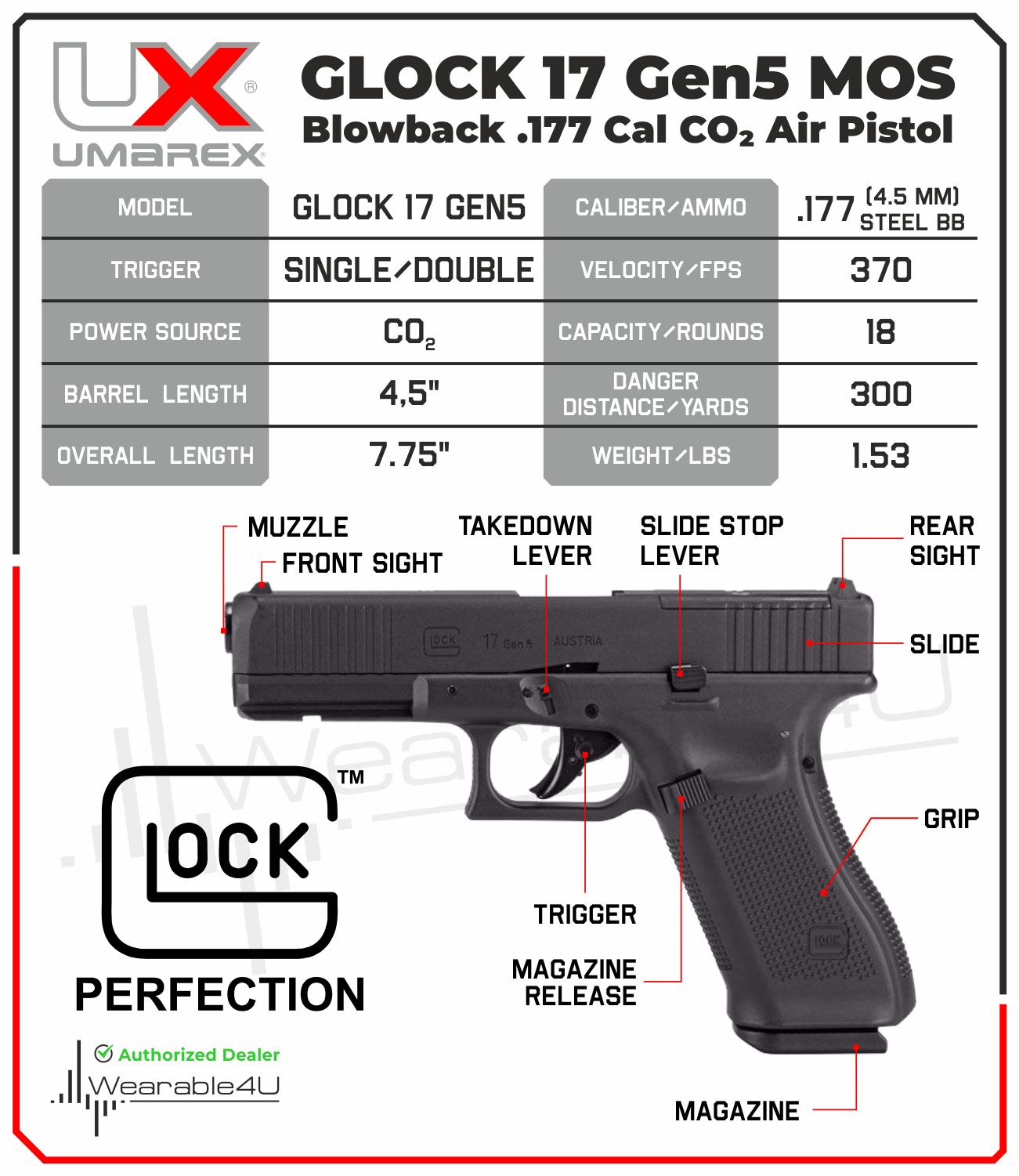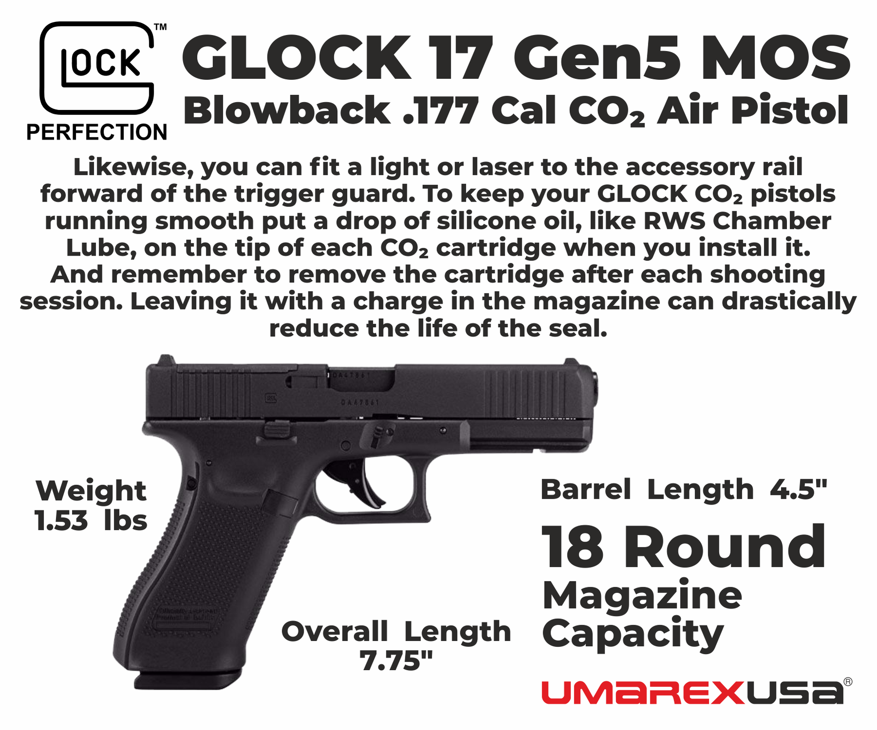 Umarex Glock 17 Gen 5 MOS Modular Optic System Blowback .177 Cal CO2 Air Pistol (2255219) Specifications: