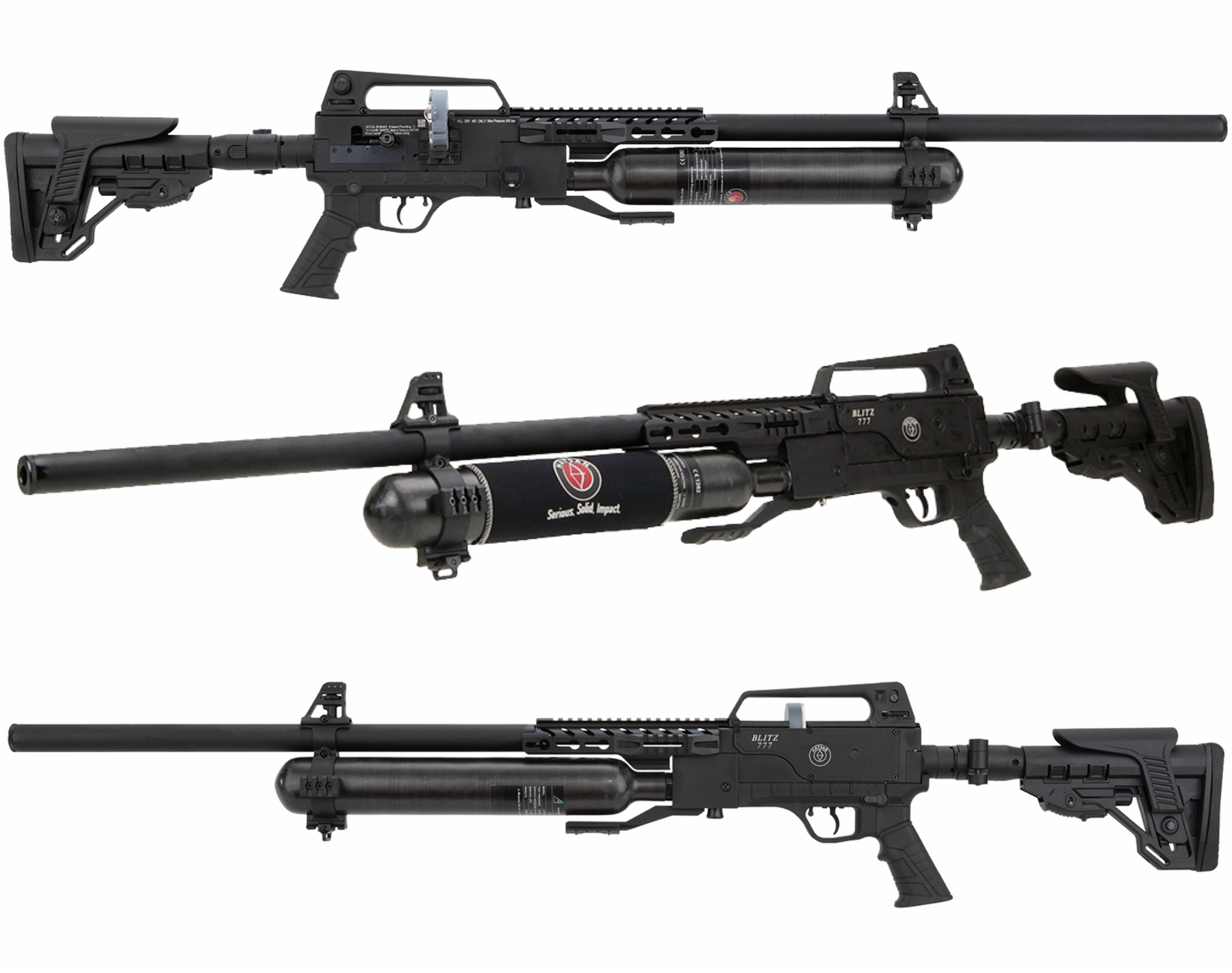 The Blitz 777 is a select fire, semi-auto / full-auto, Pre-Charged Pneumatic (PCP) air rifle. Users can easily switch between either firing mode with just the flick of a switch. The gas-operated cycling mechanism does not rely on battery power and can cycle up to 1000 rounds per minute. This PCP air rifle features a larger 700cc carbon fiber air tank that can provide over 150 shots of semi-auto or full-auto excitement. The upgraded all-weather, telescoping, folding, synthetic stock not only looks great but boasts great ergonomic features as well. An elevation adjustable cheek rest ensures proper sight alignment. Hatsan’s standard combination optics rail is integrated into the top of the receiver, allowing for the use of either 11mm dovetail or Weaver scope mounts. Three picatinny accessory rails surround the air cylinder for ultimate flexibility in accessory mounting options. The Blitz also features a new built-in digital manometer making it easy to read your pressure with a quick glance.