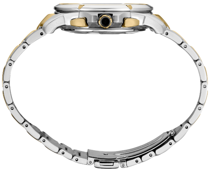 From the Coutura Collection. Delivering the perfect blend of technology and design for those on the move, the Coutura Collection combines bold angularity and shading with superior timekeeping for effortless sport/dress style. Inspired by motor sports, with a new case and bracelet design incorporating the angles and edges of racecar architecture, this dashingly sculpted chronograph features a multi-layer carbon-fiber patterned black dial styled to suggest a dashboard, with prominent 24-hour and chronograph minute subdials at 3 and 9 o’clock, tachymeter outer ring, date calendar, red chronograph hand, and LumiBrite hands and markers. Applied markers and subdial rings add a rich dimensionality, while the gold accents punctuating the bezel provide a sense of propulsive action. Crafted of stainless steel in a rich two-tone finish, this dynamic watch includes a sapphire crystal, screwdown caseback, tri-fold push button release clasp and classic cabochon crown. The chronograph function offers timing to 60 minutes in 1/5-second increments with split time measurement. 10 bar, 100M Water Resistant