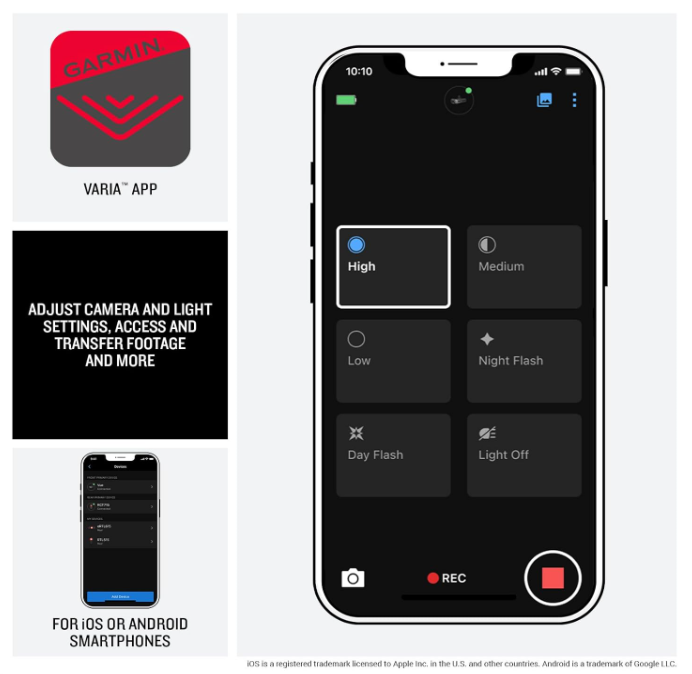 VARIA APP INTEGRATION. Use the Varia app to control both camera and light functions. Easily edit your videos, manage footage, and add data overlays like speed or route information for a full ride recap.