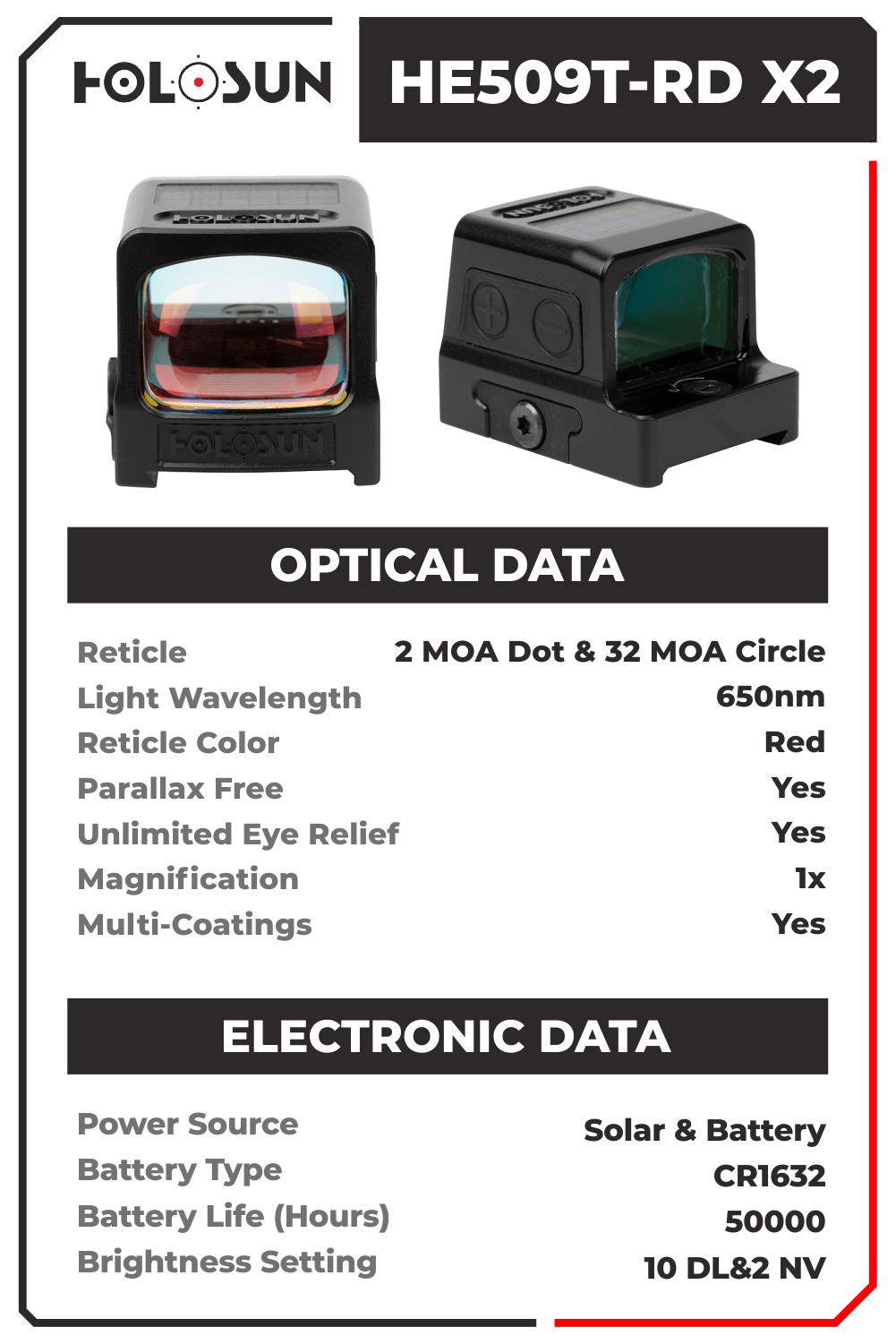 The HE509T-RD X2 is an enclosed reflex optical sight. Features include a Titanium housing, Holosun’s Super LED with up to 50k hours battery life, Multi-Reticle System, Solar Failsafe, and Shake Awake. This X2 version adds improved glass clarity, Lock Mode, and a full Multi-Reticle System providing 32MOA circle with 2MOA dot, dot only, or circle only reticle options.
