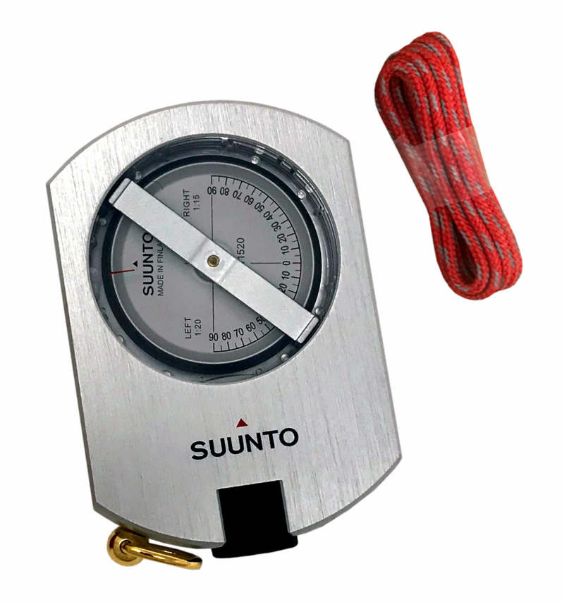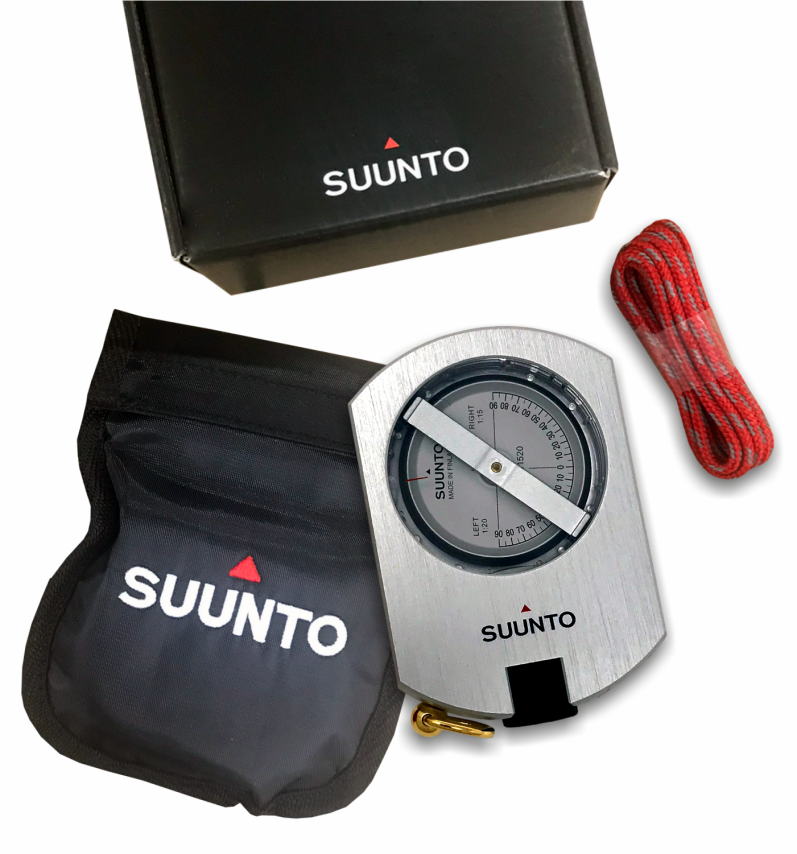 Because this instrument does not incorporate a prism, the basic distance e.g. 15 m has to be determined using a tape measure along the ground. Take the top and base readings and add or subtract them to get the apparent height. Of the four nomograms on the card, choose the one corresponding the measuring distance. Locate the apparent height on the right hand scale. On the double scale on the left, locate the reading obtained from sighting the base of the tree. Note that readings for falling and rising gradients should be taken from different sides of the scale. Connect these two points of the nomogram with a straight line. The centre scale of the nomogram now indicates the true height of the tree.