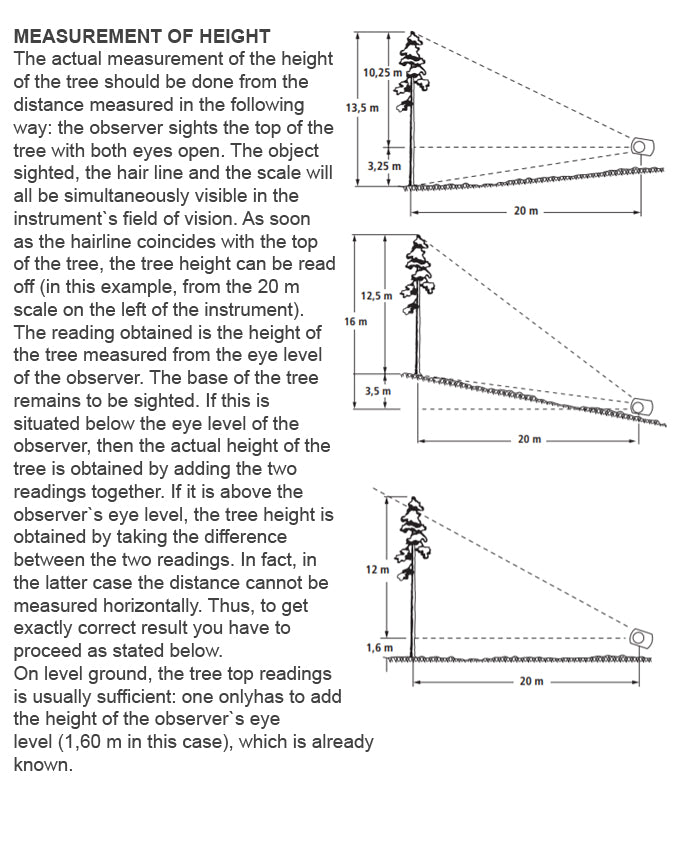 The actual measurement of the height of the tree should be done from the distance measured in the following way: the observer sights the top of the tree with both eyes open. The object sighted, the hair line and the scale will all be simultaneously visible in the instrument`s field of vision. As soon as the hairline coincides with the top of the tree, the tree height can be read off (in this example, from the 20 m scale on the left of the instrument). The reading obtained is the height of the tree measured from the eye level of the observer. The base of the tree remains to be sighted. If this is situated below the eye level of the observer, then the actual height of the tree is obtained by adding the two readings together. If it is above the observer`s eye level, the tree height is obtained by taking the difference between the two readings. In fact, in the latter case the distance cannot be measured horizontally. Thus, to get 13,5 m 3,25 m 10,25 m 20 m 3,5 m 12,5 m 16 m 20 m 6 exactly correct result you have to proceed as stated below. On level ground, the tree top readings is usually sufficient: one only has to add the height of the observer`s eye level (1,60 m in this case), which is already known.