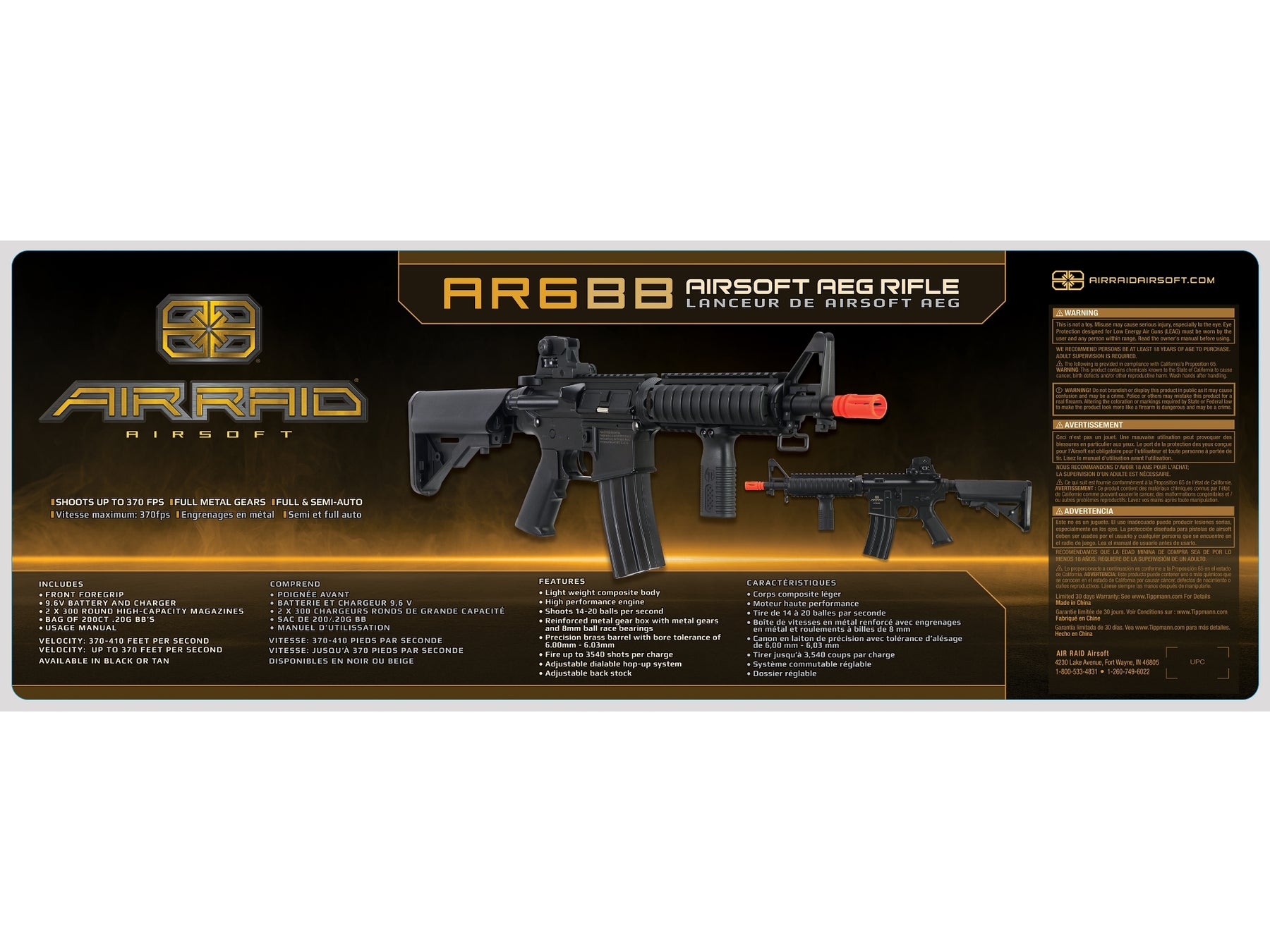 Air Raid AR6BB is an airsoft AEG rifle that is built tough with a durable composite body and a high-performance engine with full metal gears for long lasting shooting speed. AR6BB shoots up to 370 FPS and has both full /semi-auto shooting modes. Airsoft rifle has all the top features needed such as adjustable stock and foregrip, reinforeced gear box, various picatinny rails, adjustable hop-up system, brass barrel.