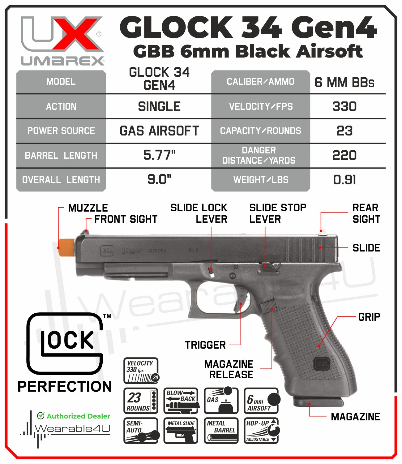 Umarex Glock 34 Gen 4 6mm Green Gas Blowback Airsoft Pistol (2276373) Specifications: