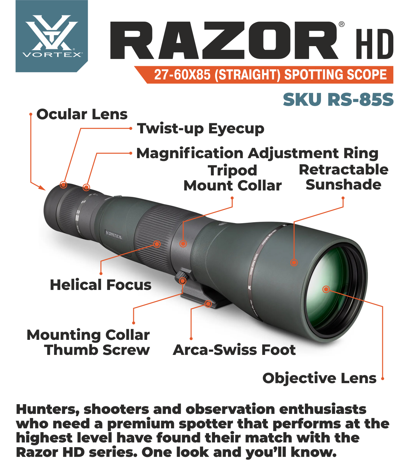 Setting the standard in high-end optical technologies, precision craftsmanship and ultra-sleek functionality, the Razor HD is one of the finest spotting scopes on the market. Advanced optical elements eliminate aberrations for distortion-free, flat field images with unmatched edge-to-edge sharpness, as well as remarkable clarity, resolution and color accuracy. Hunters, shooters and observation enthusiasts who need a premium spotter that performs at the highest level have found their match with the Razor HD series. One look and you’ll know.