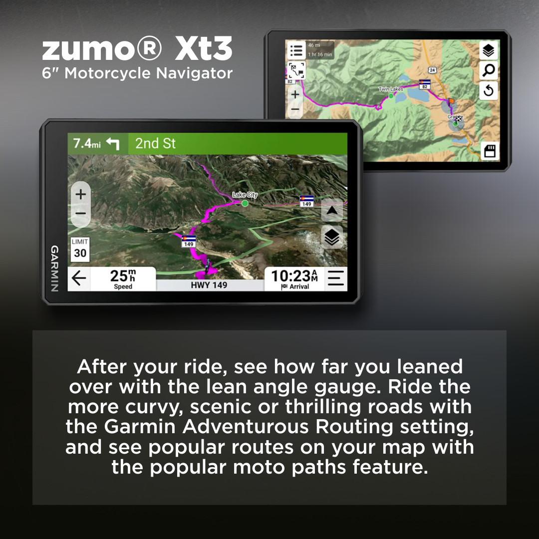 • Ride the more curvy, scenic, thrilling roads with the Garmin Adventurous Routing setting; find the best-rated routes from other riders with the great rides database via the Tread smartphone app; see popular roads for riding on the map with popular moto paths