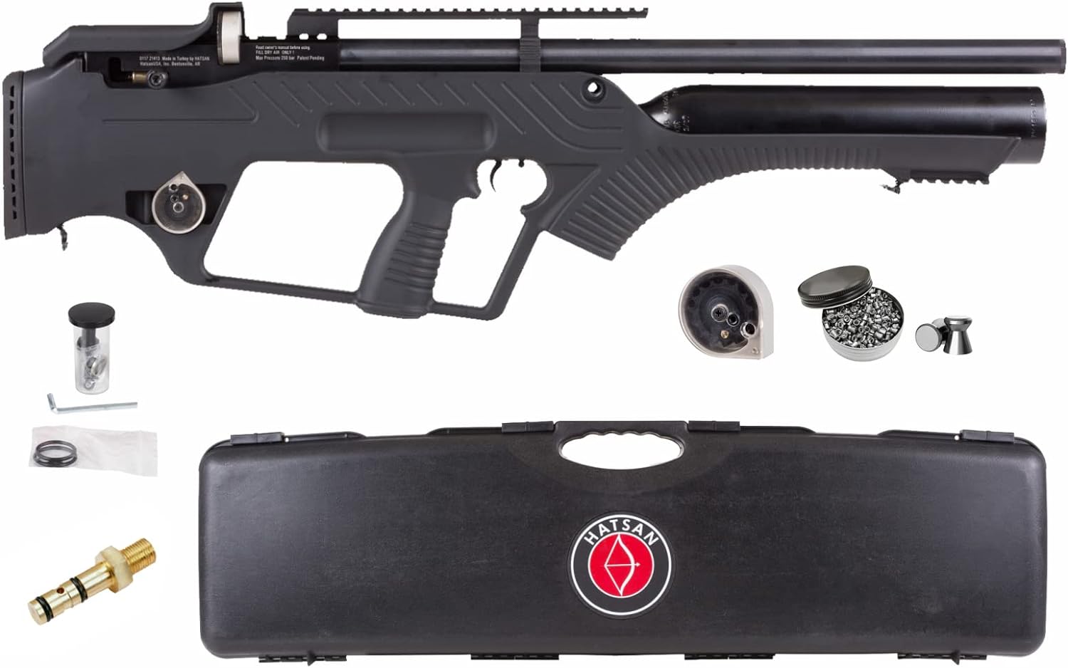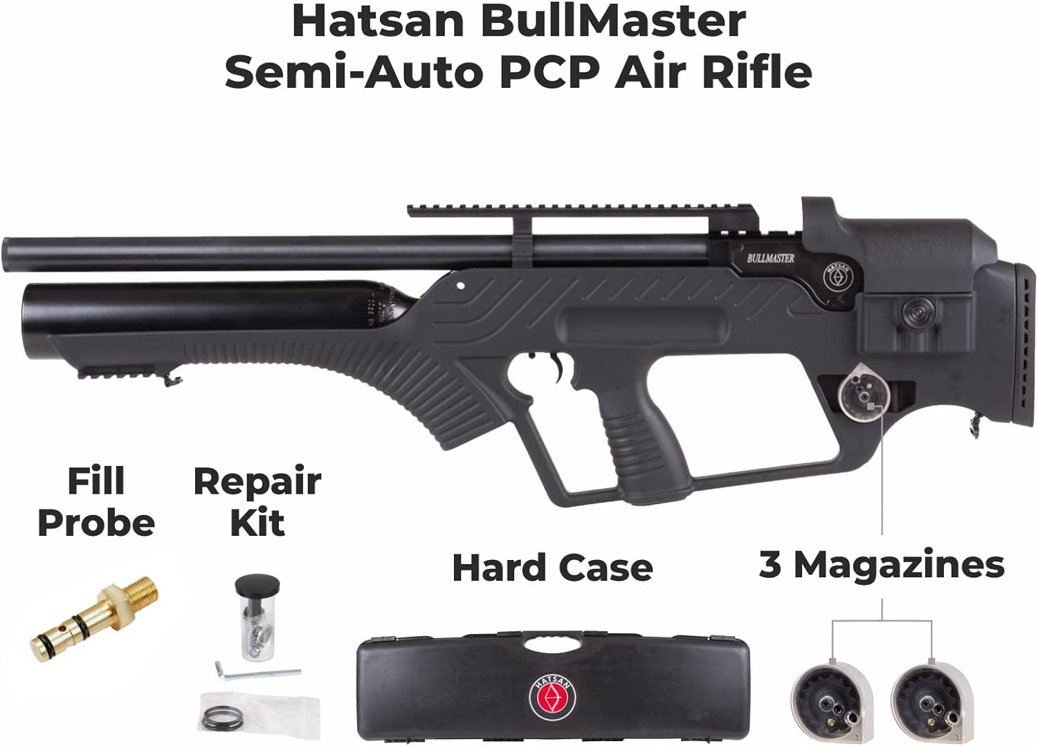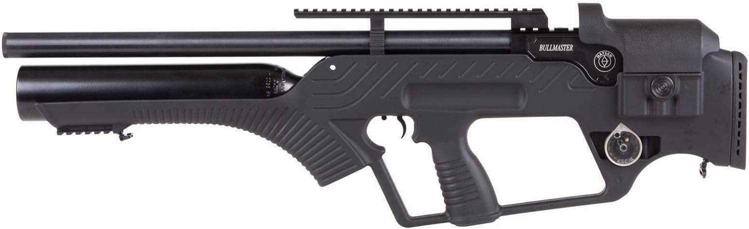 View moreThe Hatsan’s semi-automatic PCP (pre-charged pneumatic) BullMaster bullpup Air Rifle offers a whole new experience in shooting. Built with one of the largest available air cylinders, at 500cc with a max fill pressure of 250 BAR (3,625 psi). With a fully shrouded barrel, precision rifled and choked, the BullMaster is built for accuracy. Featuring a DaSoft coated, all-weather synthetic stock that is built with an adjustable comb and forend which houses the built-in pressure gauge, 2 magazine carrying slots, and ventilated rubber butt pad, this bully has awesome bones. Not to mention the integrated combo 11mm dovetail & Weaver optic rail, for your scope of choice, and the picatinny rail on the forend for added accessories. This bullpup also comes with 3 spring-loaded magazines, fitted sling swivels, a 1/8″ BSPP threaded fill probe and a durable hard case to store it all in