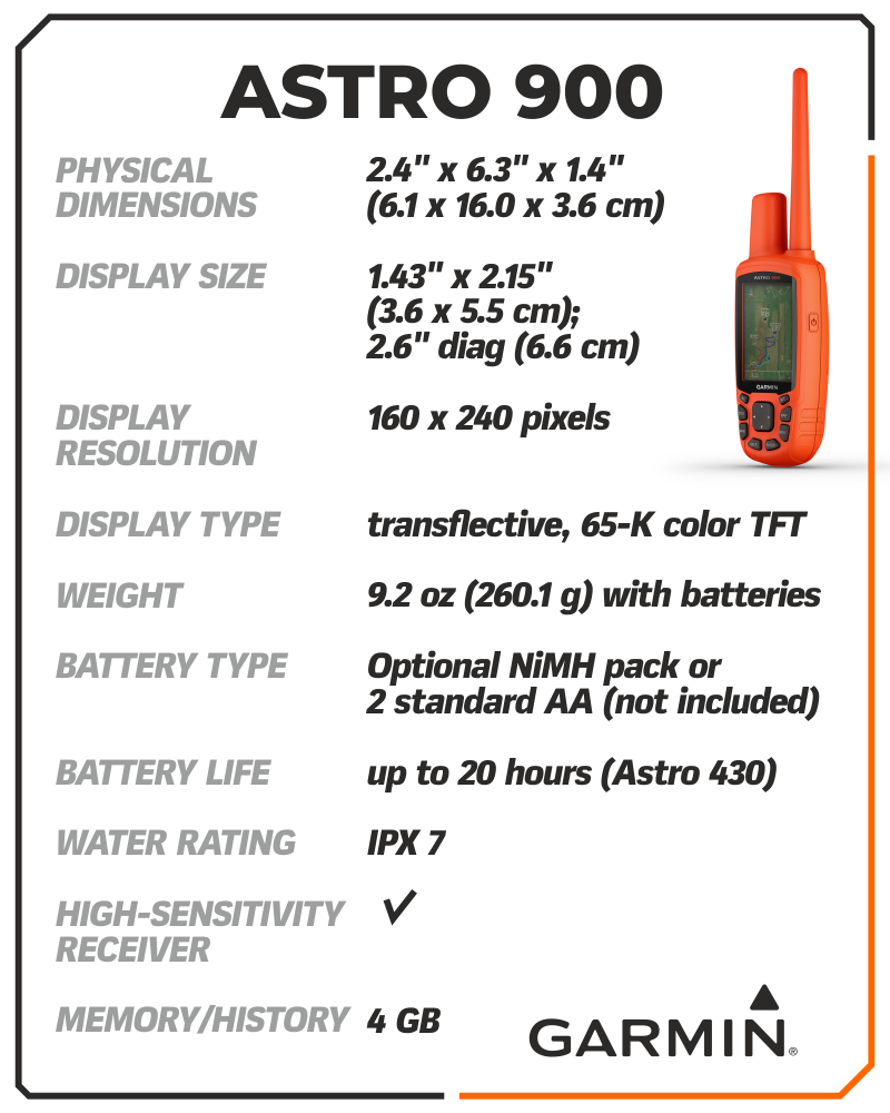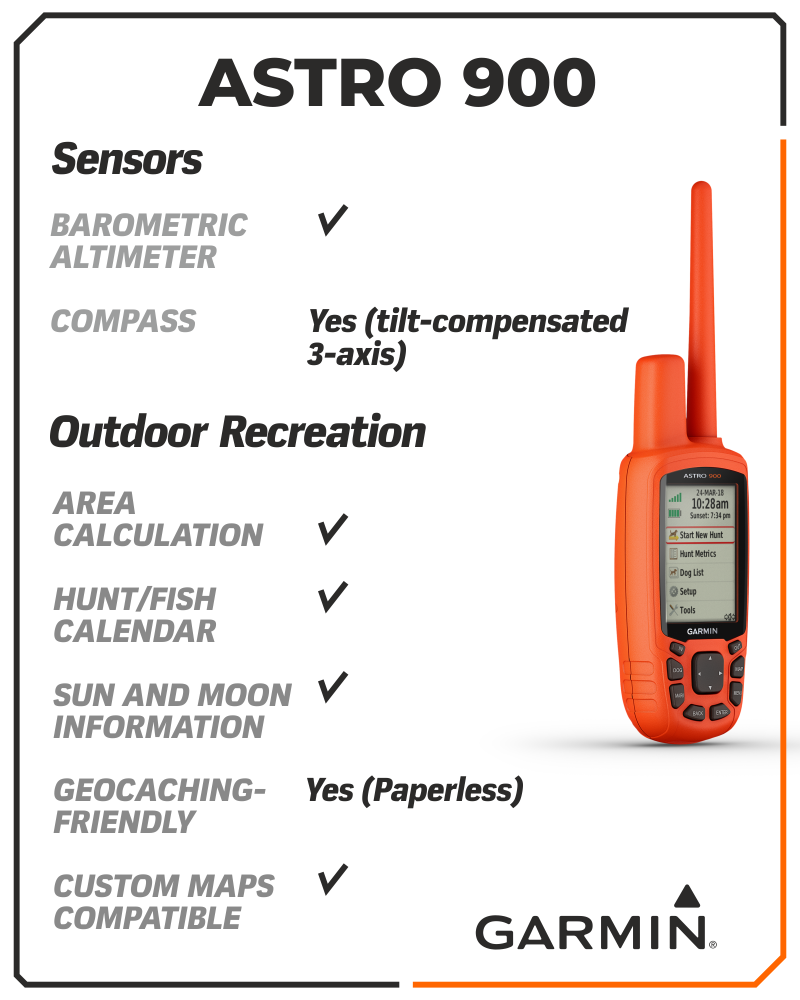With an expanded ecosystem of wireless connectivity options, Astro 900 can support unit-to-unit data transfer with a variety of compatible Garmin devices. For example, Garmin DriveTrack can receive and display dog positions on its moving map — with topographic or satellite image views — showing navigation cues to your dog’s current location. Likewise, a compatible fēnix GPS watch can receive dog status updates and alerts for viewing at a glance on your wrist. Also, while you’re in the field, Astro 900 lets you link and share wirelessly with your buddies’ compatible devices, such as the Oregon handheld, Montana handheld, GPSMAP 64 chartplotter or other ANT+ connectivity-enabled devices, to help coordinate hunt logistics on the go.