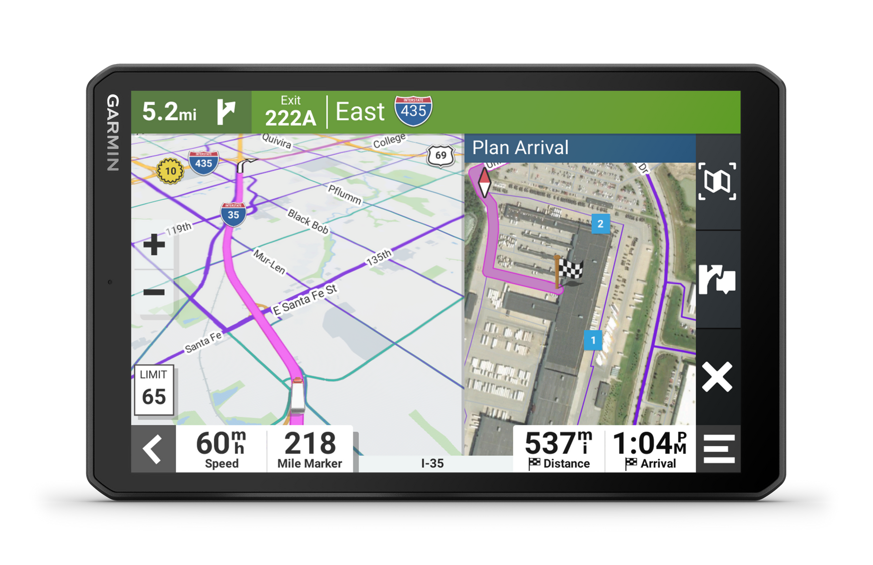This large 8'' navigator features custom routing based on the size and weight of your rig, strategic suggestions for fueling and breaks, and leading-edge arrival planning. Keep it clear and easy with a crisp high-resolution 8'' display in landscape or portrait view. Get the best route for your rig with custom truck routing and road warnings, such as steep grades ahead. Execute a smooth arrival with aerial views of loading docks and truck entrances. Plan like the pro you are. See the best places for fuel stops, comfort breaks and overnight stays. Need a shower? A refuel? Use your Truck & Trailer Services directory. See it all. The split-screen view shows your route overview and upcoming weather alongside the active map.