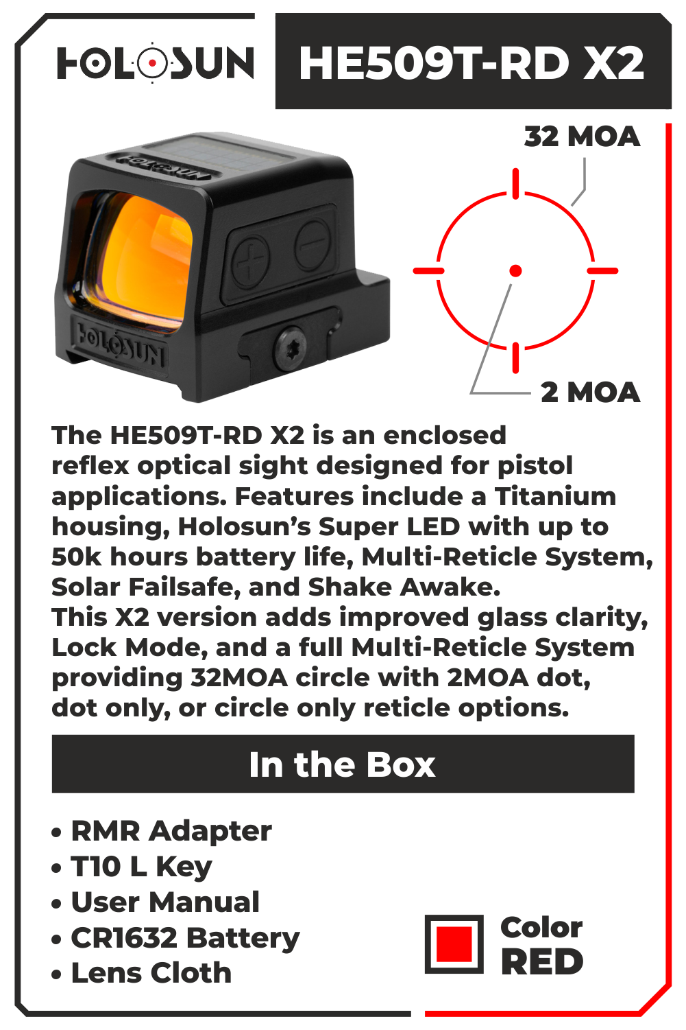 The HE509T-RD X2 is an enclosed reflex optical sight. Features include a Titanium housing, Holosun’s Super LED with up to 50k hours battery life, Multi-Reticle System, Solar Failsafe, and Shake Awake. This X2 version adds improved glass clarity, Lock Mode, and a full Multi-Reticle System providing 32MOA circle with 2MOA dot, dot only, or circle only reticle options.