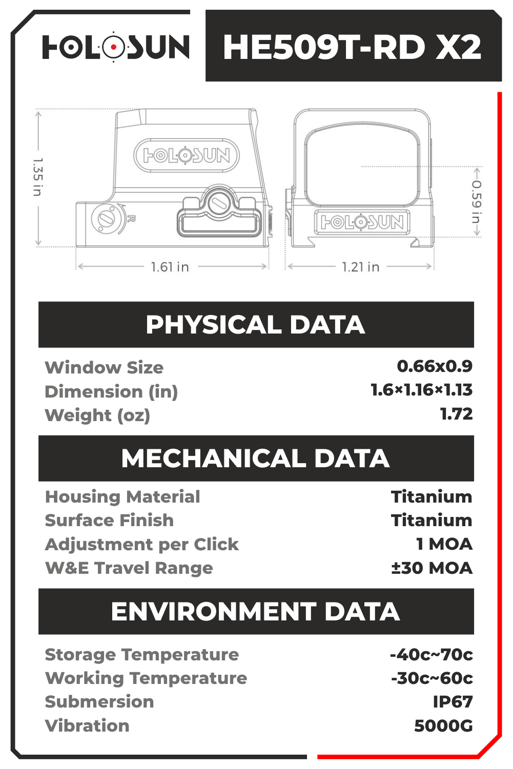 Holosun HE509T-RD X2 Enclosed Reflex Optical Multi-Reticle Red Dot Sight Specifications: