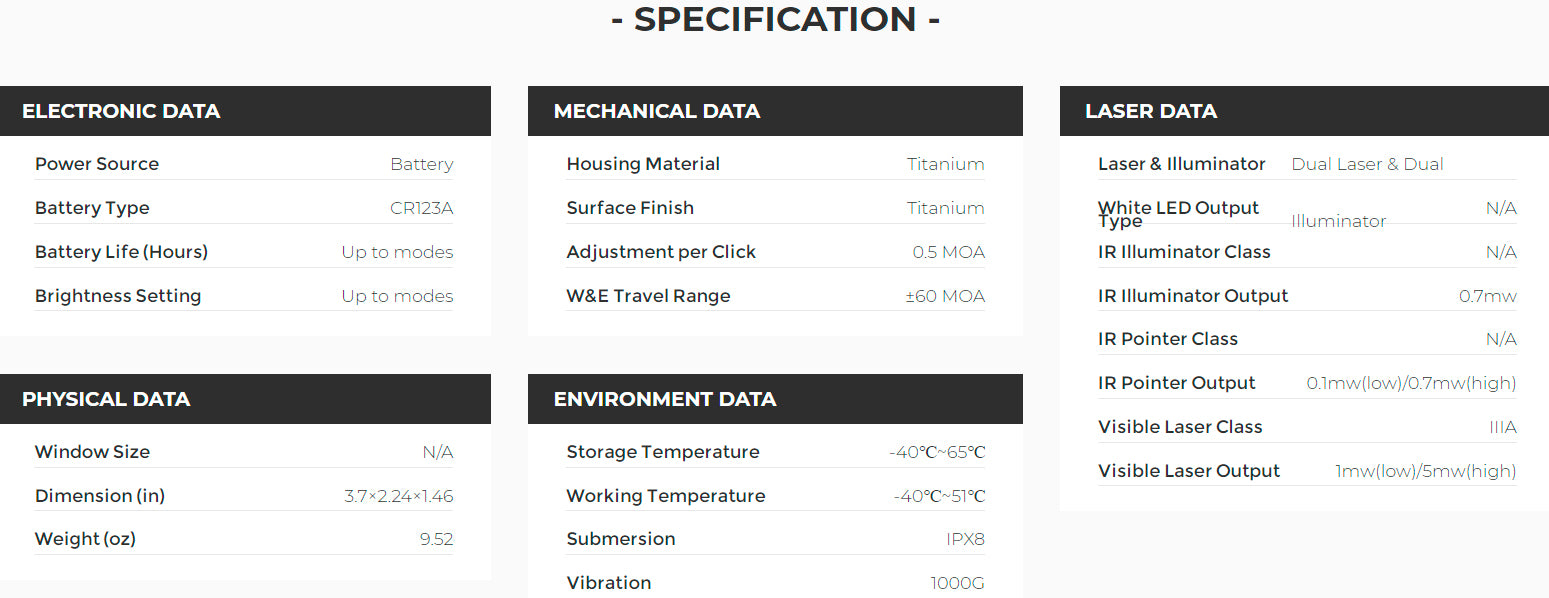 - Laser & Illuminator Type Dual Laser & Dual Illuminator