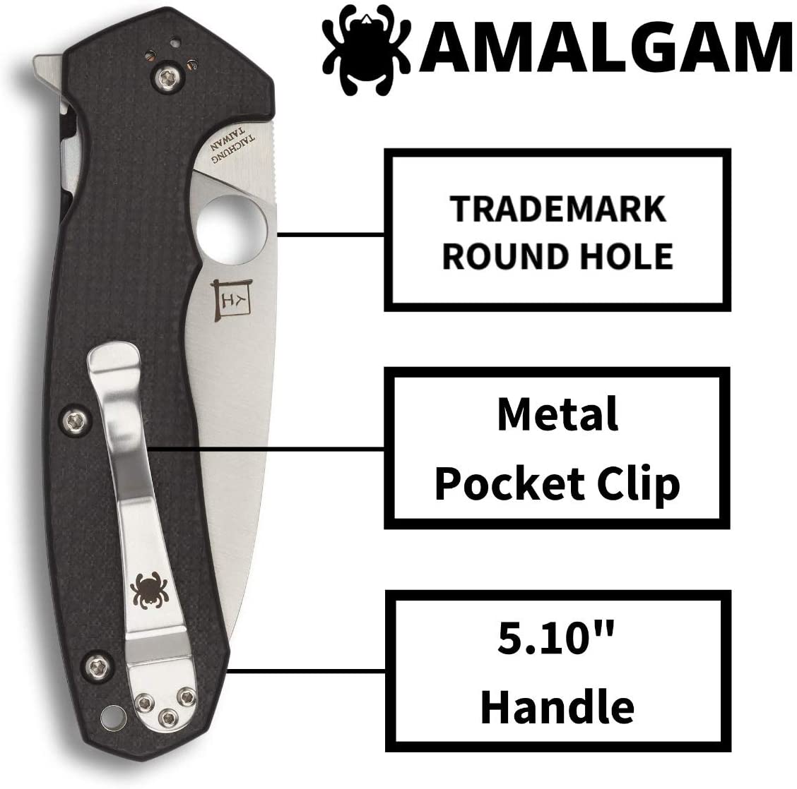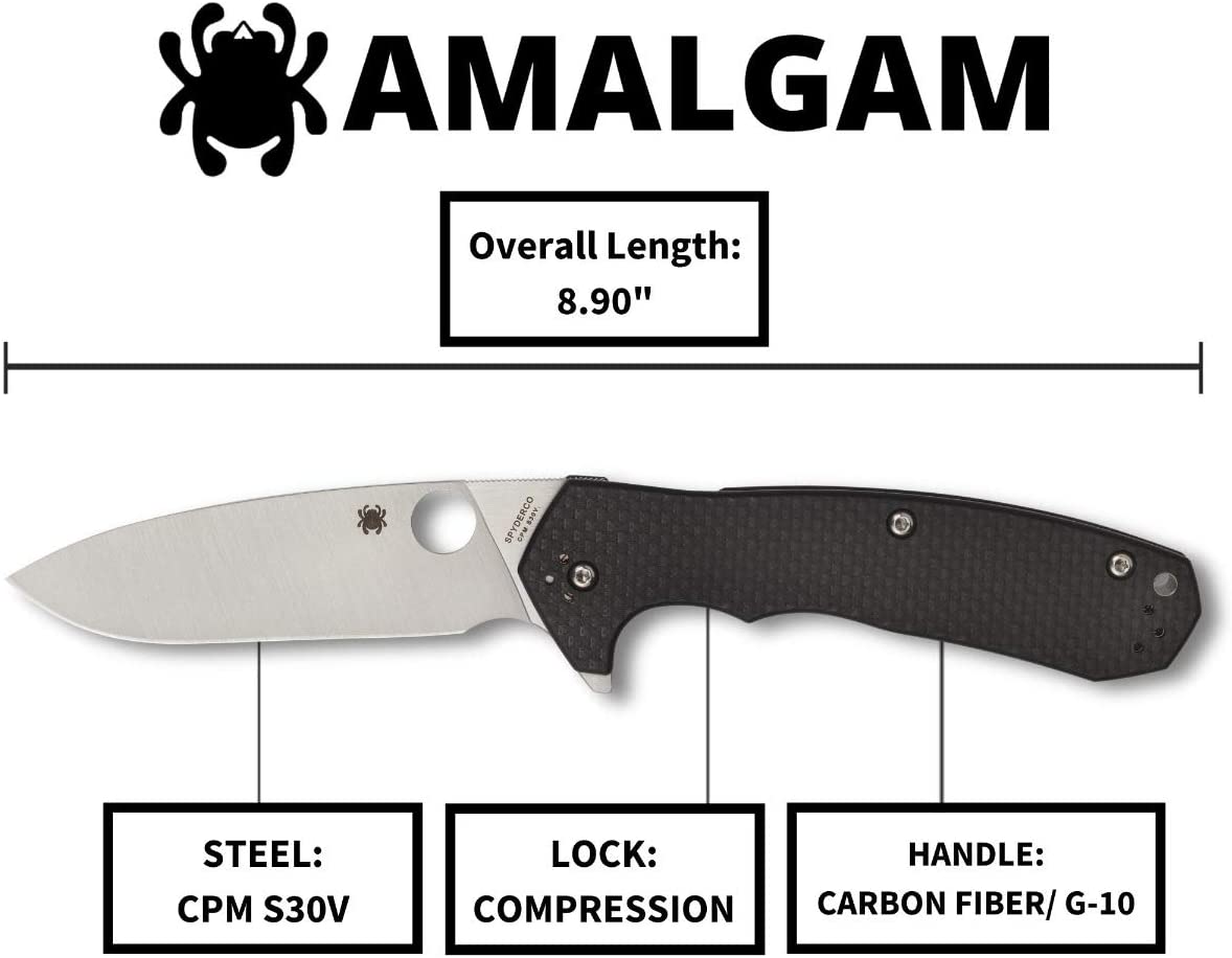 Designed from the ground up as a practical, versatile working knife, the Amalgam combines all the advantages of Spyderco’s Compression Lock mechanism, a fully accessible Trademark Round Hole, and a flipper opener into one synergistic package. The brainchild of a Mechanical Engineering student and knife enthusiast named Brian Lai, the Amalgam features a broad, drop-point blade crafted from American-made CPM S30V stainless steel. The PlainEdge blade is full-flat ground for exceptional edge geometry and showcases a beautiful satin finish. It also rides on special low-friction ball-bearing washers that give it an incredibly smooth action and help ensure swift, positive, one-handed opening with either its index-finger flipper or its Round Hole. In the open position, the blade’s flipper also serves as a highly functional lower guard. The Amalgam’s handle features skeletonized stainless steel liners nested into textured carbon fiber/G-10 laminate scales. This keeps the ergonomic handle slim and pocket friendly and complements its open-backed construction to minimize the knife’s overall weight and accentuate its balance. A four-position clip and lined lanyard hole support all possible carry preferences and allow the Amalgam to be brought into action quickly and positively with either hand.