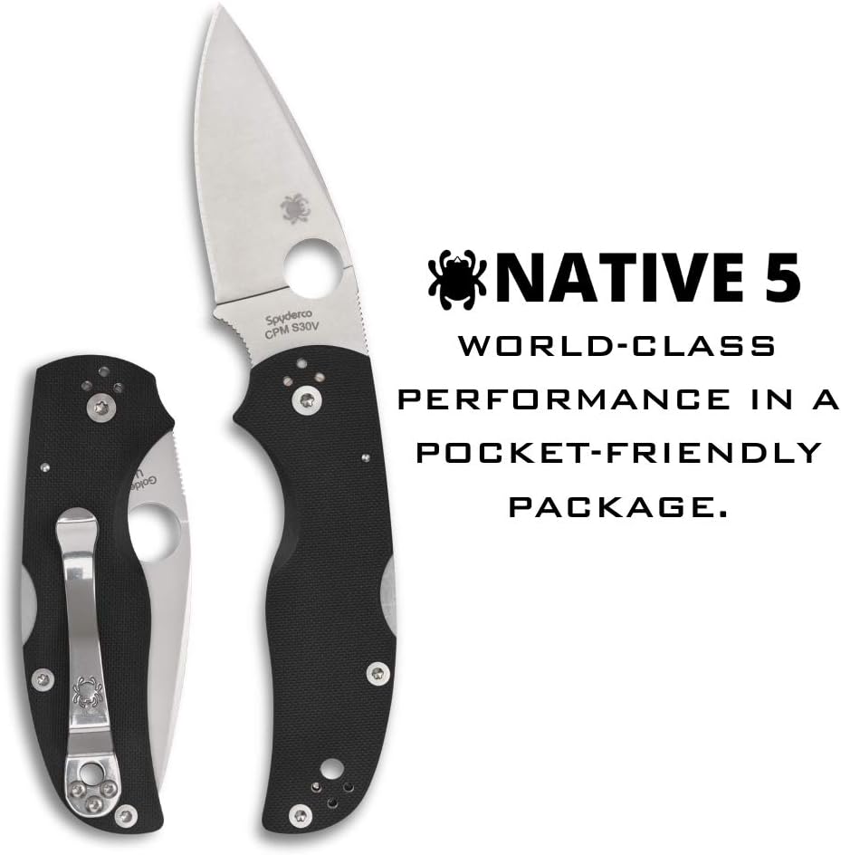 Since its original release in 1997, the Native has been a mainstay of the Spyderco product line and a shining example of our American-made quality and innovation. Now in its fifth generation of design, the current Native 5 proudly reflects our tireless commitment to Constant Quality Improvement (C.Q.I.) by boasting a number of significant design and engineering advances. This knife’s ergonomic handle features a solid stainless steel back spacer and textured G-10 scales. This linerless construction style reduces weight, while ensuring impressive structural strength and solid support for the knife’s highly refined back lock mechanism. The product of extensive research, development, and testing, the Native 5’s back lock redefines the state of the art in the engineering and execution of this elegantly simple mechanism. It offers increased strength, an exceptionally smooth action, an improved self-close function, and even greater resistance to wear and tear than previous versions. The blade of this knife is crafted from CPM S30V stainless steel and features a full-flat grind, a distal taper, and an understated swedge that combine to offer both a distinctive appearance and exceptional edge geometry. A forefinger choil also supports the option of a “choked up” forward grip for increased leverage and control during use. To ensure swift, positive opening with either hand, the blade includes a fully accessible Trademark Round Hole. This feature complements the back lock and stout four-position hourglass clip to make all aspects of the Native 5’s carry, deployment, and operation completely ambidextrous.
