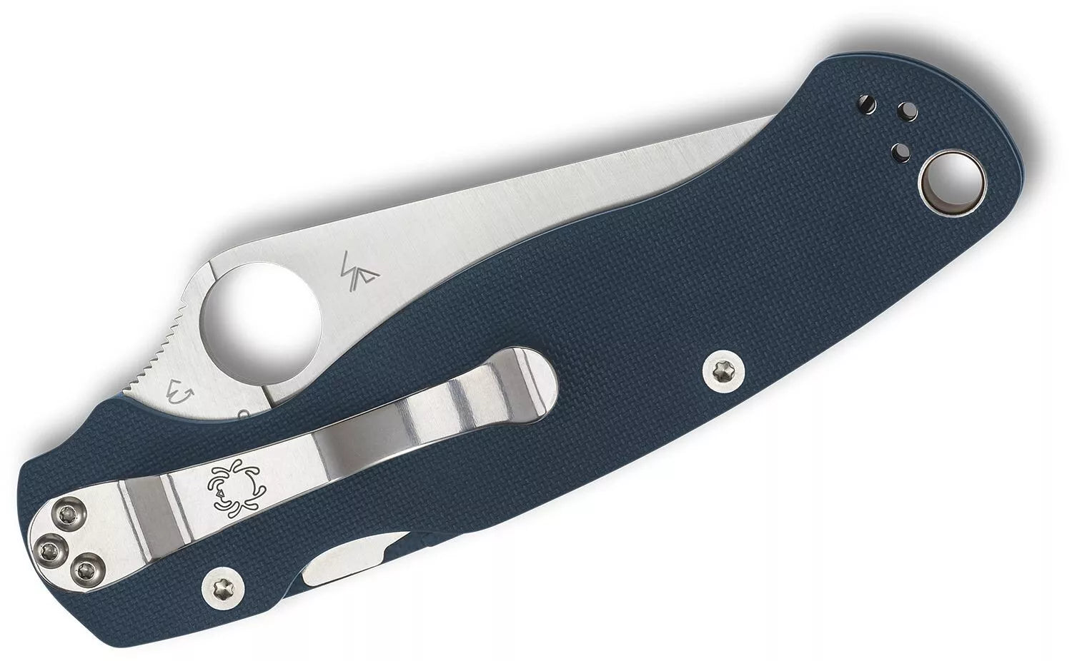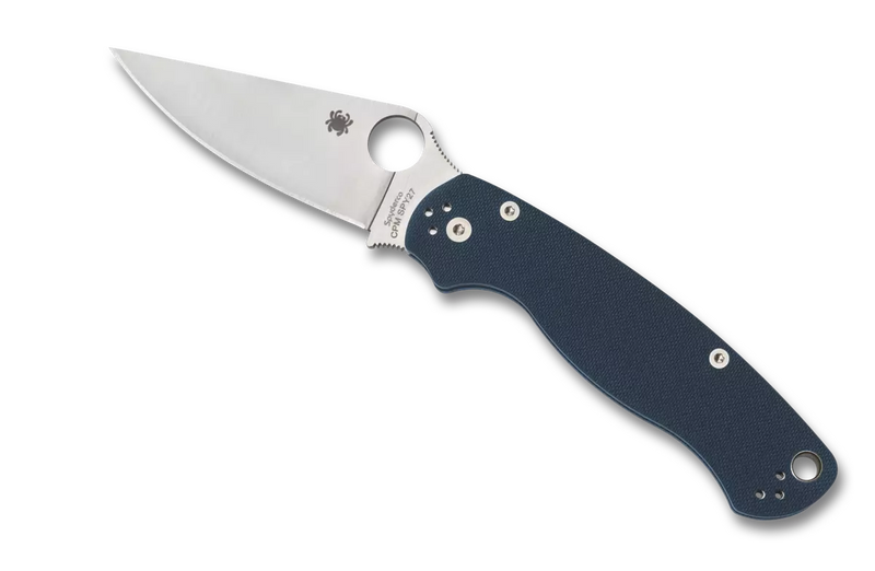 The ParaMilitary 2 is one of Spyderco’s most popular and iconic designs. It is therefore fitting that it should serve as a platform to showcase our proprietary blade steel—CPM SPY27. Developed in close cooperation with Crucible Industries and exclusive to Spyderco, CPM SPY27 enhances the proven alloy formula of VG-10 stainless steel with niobium and nitrogen, additional carbon, molybdenum, and vanadium, and the many advantages of Crucible’s state-of-the- art particle metallurgy process. To further highlight this elite blade steel, this knife’s handle is capped with peel-ply-textured G-10 scales in a distinctive cobalt blue—one of the signature colors of our SPY27 family of knives.