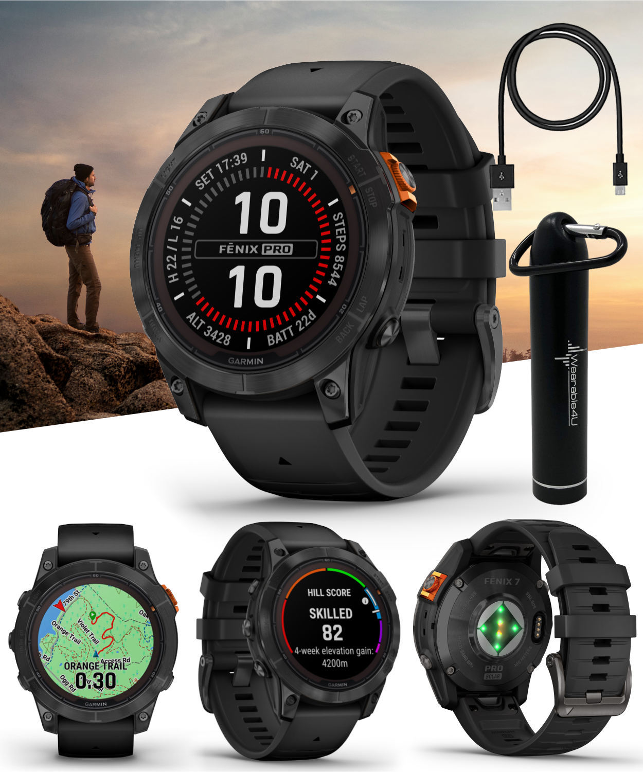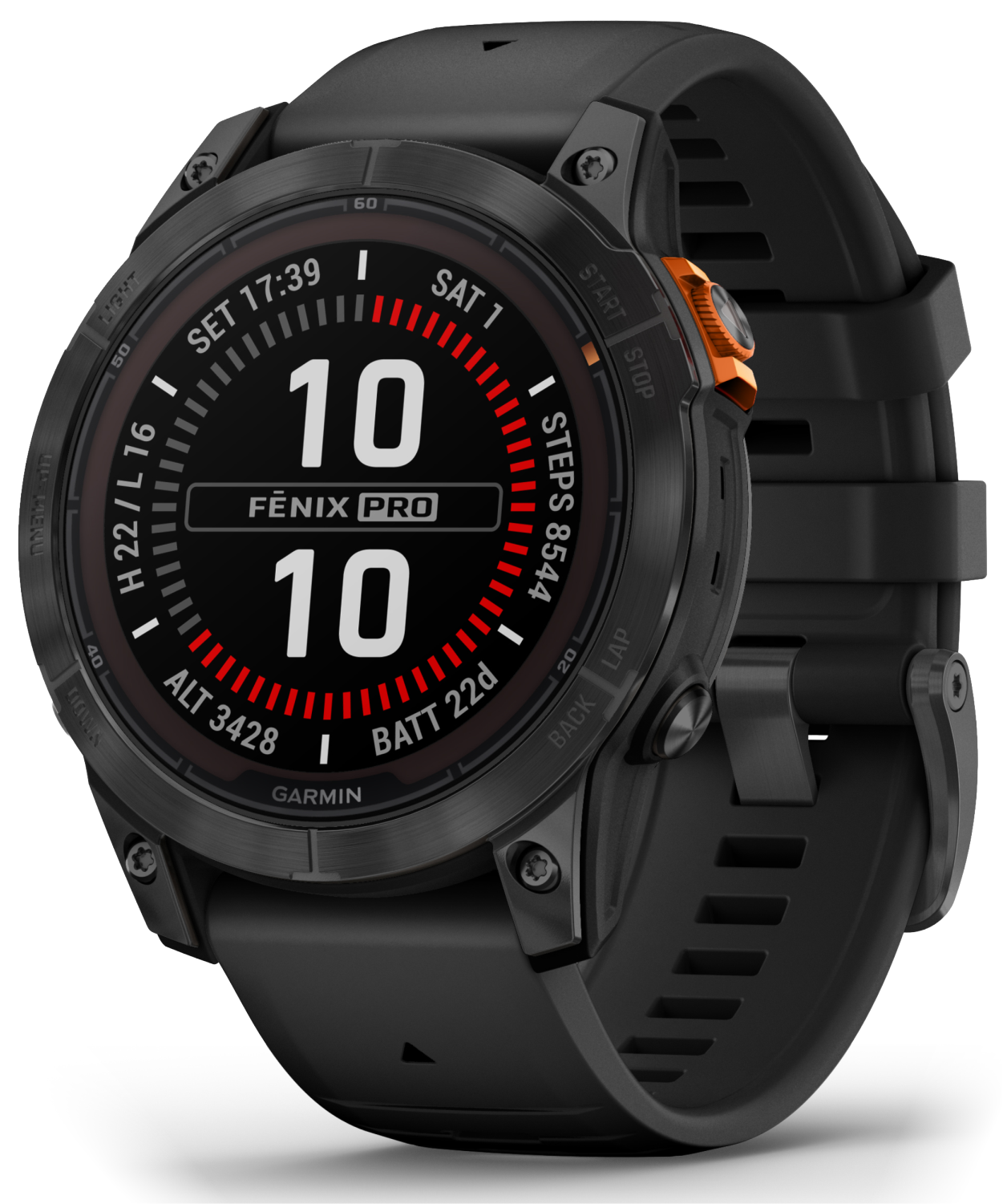 fēnix 7X / 7 / 7S Pro Solar series is the ultimate multisport GPS smartwatch optimized for smaller wrists and designed to perform all day, every day. Get weeks of battery life with the Power Glass or Power Sapphire (Sapphire Edition) solar charging lens. Meet any challenge with advanced training features such as hill score, which measures your climbing performance over time, and real-time stamina updates to gauge your stamina potential. For a more complete picture of your health, training and recovery, tap in to 24/7 health and wellness monitoring with advanced sleep tracking, HRV status, Pulse Ox and more (this is not a medical device, and data presented is intended to be a close estimation of metrics tracked; Pulse Ox not available in all countries). When the sun sets, use the LED flashlight to stay visible or find your way. Download TopoActive maps from around the world to keep your explorations on track. Navigate on the slopes with 2,000 preloaded ski resort maps worldwide. Gain superior positioning accuracy while optimizing battery life, thanks to multi-band GPS with SatIQ technology.