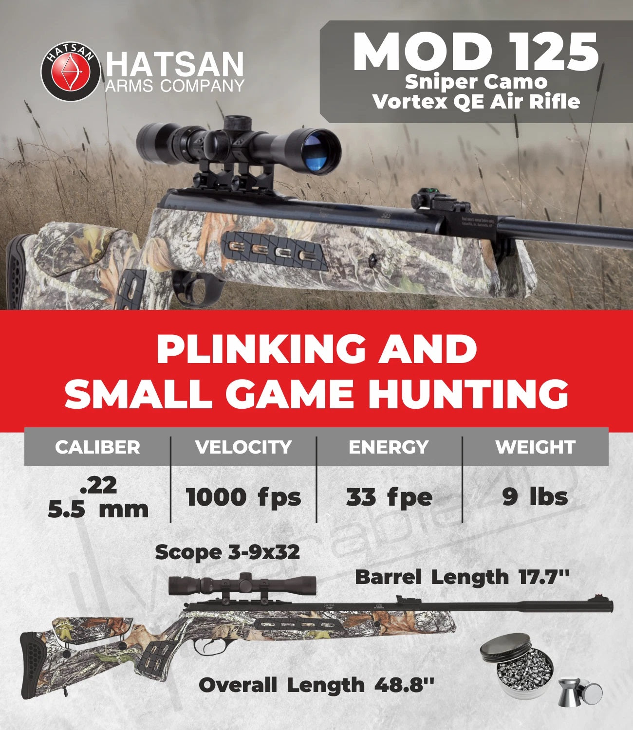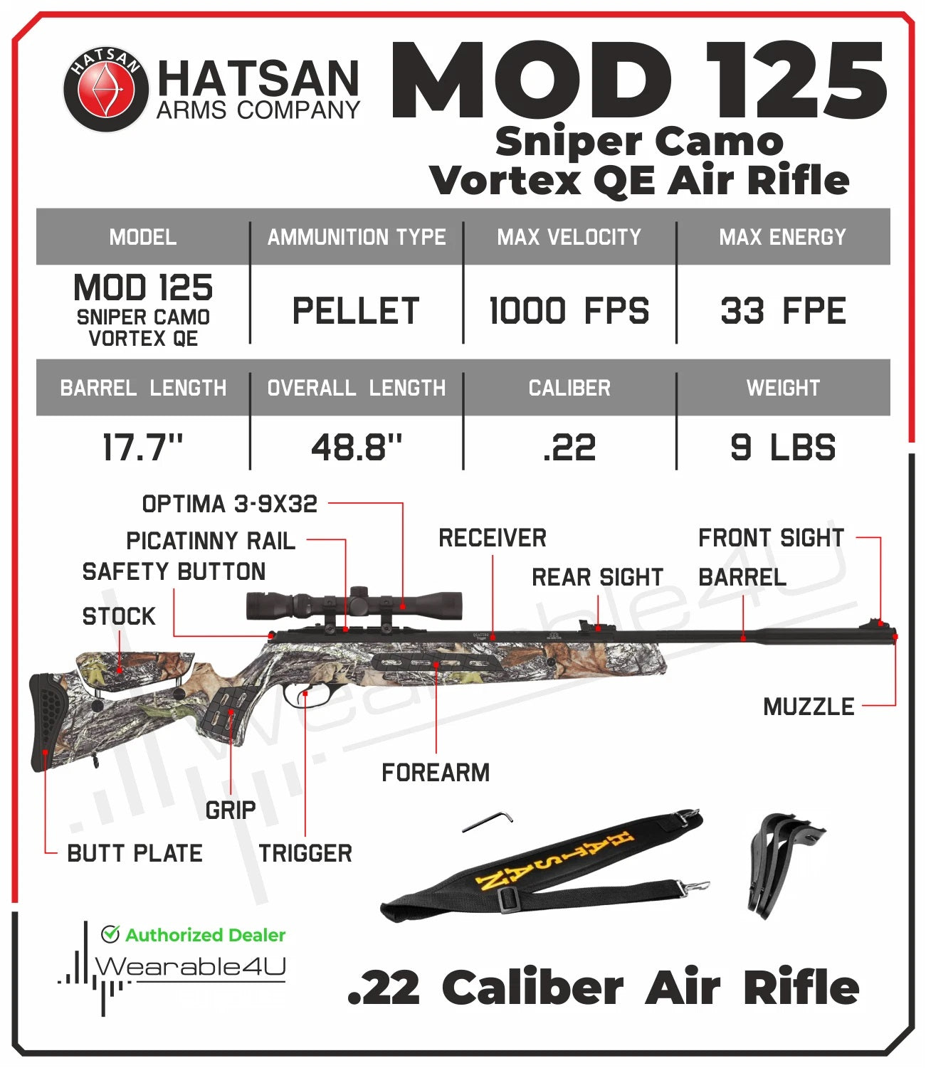 Hatsan MOD 125 Sniper Camo Vortex QE .22 Caliber Air Rifle Specifications: