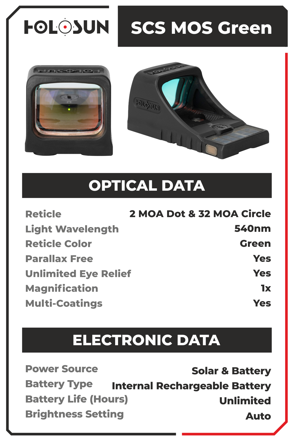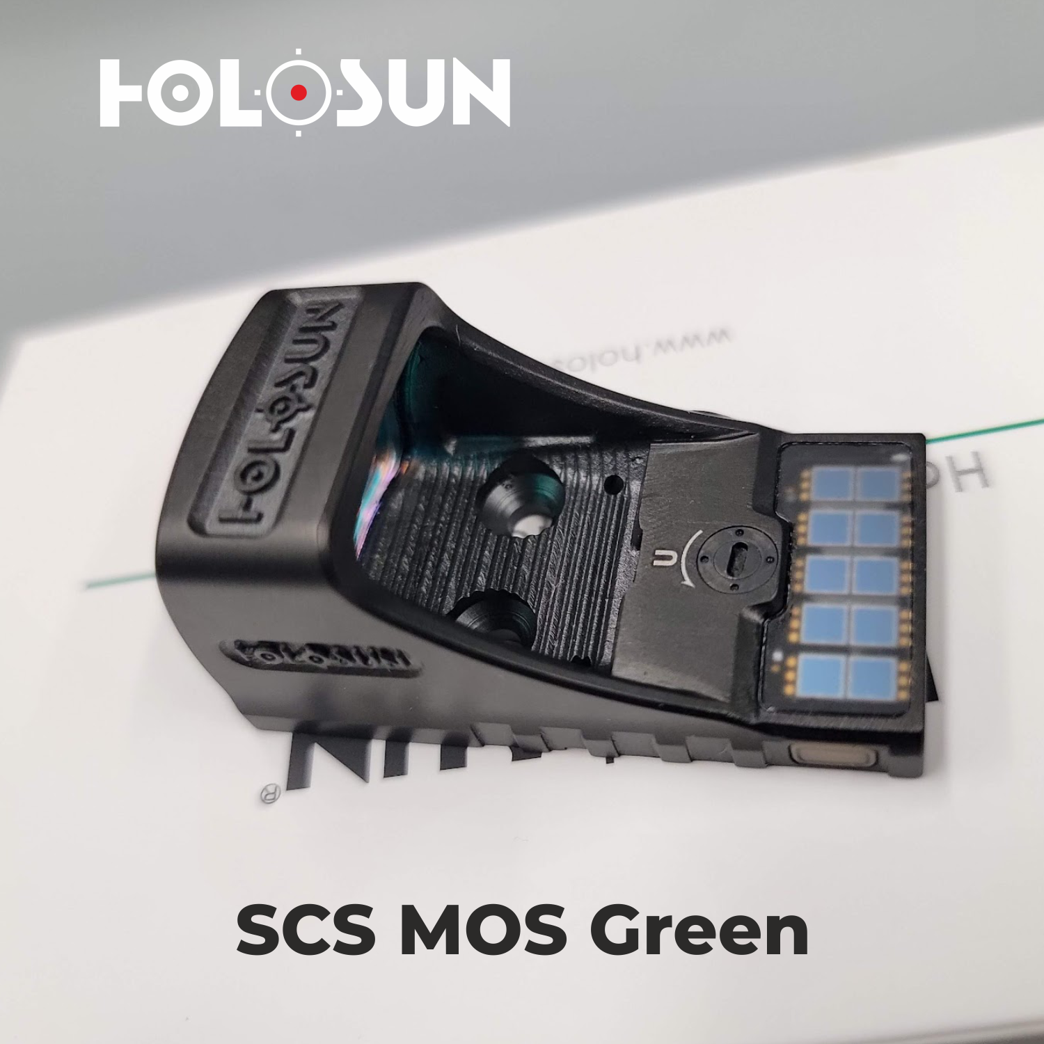 The SCS-MOS (Solar Charging Sight) is a direct attachment optic offering the lowest profile deck height for use with standard-height iron sights. The SCS-MOS combines solar power, rechargeable power storage, an auto-adjusting reticle brightness system with override function to potentially operate indefinitely in multiple lighting conditions.