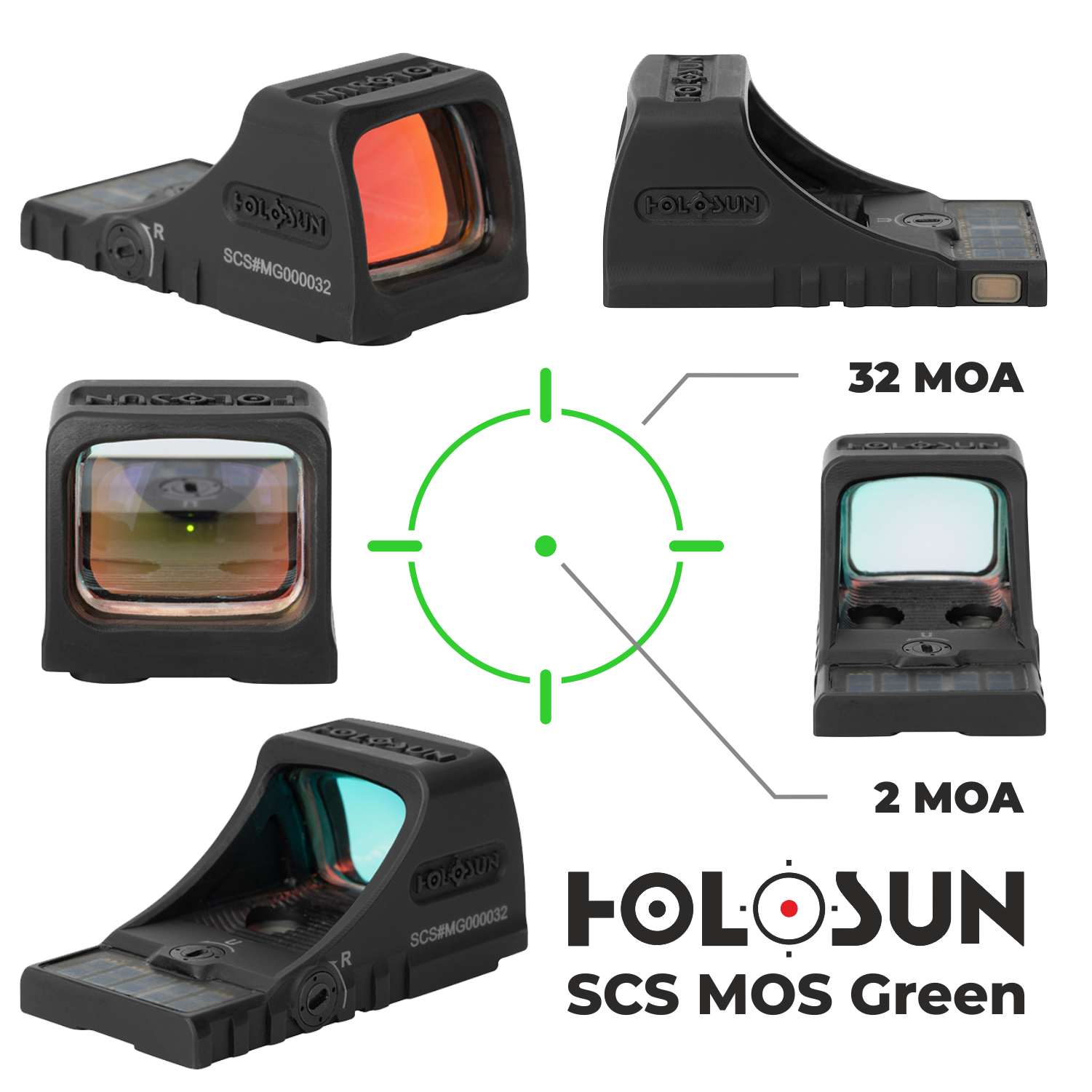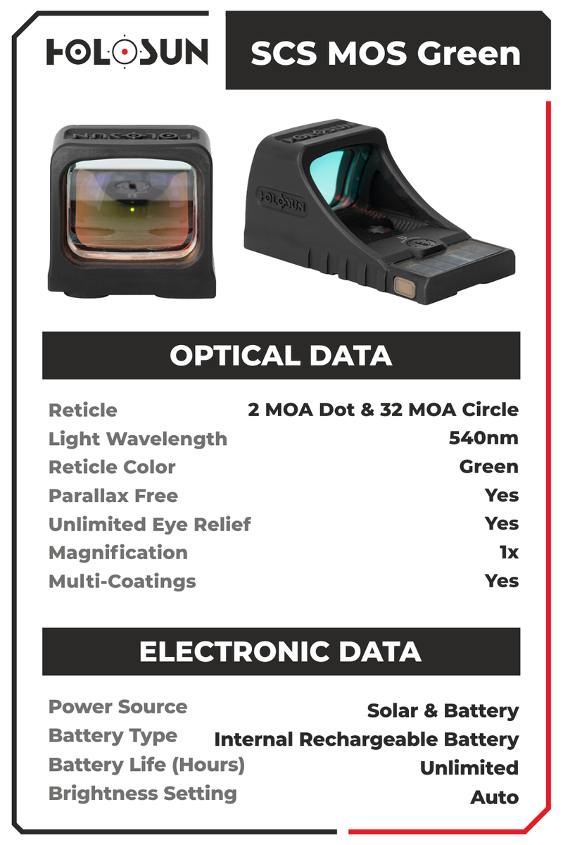Holosun SCS MOS Green Multi-Reticle 2MOA & 32MOA Circle Dot Reflex Sight (SCS-M-GR) Specifications: