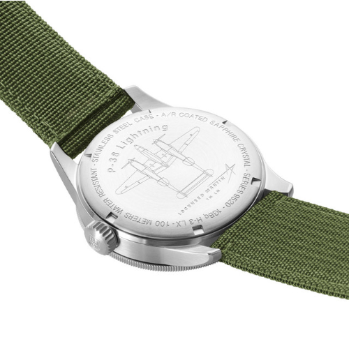 View moreThe Luminox P-38 LIGHTNING with a 42 mm black dial and sapphire crystal comes with a flexible green textile strap with Luminox signature buckle. The GMT function for dual timezones makes it a must-have for any worldwide traveler. A nod to the traditional B-Uhr navigation watch of the 1940's, just below the 12 o'clock is an upwardly pointing triangle with two dots, providing quick orientation and the ability to read the time at a glance.