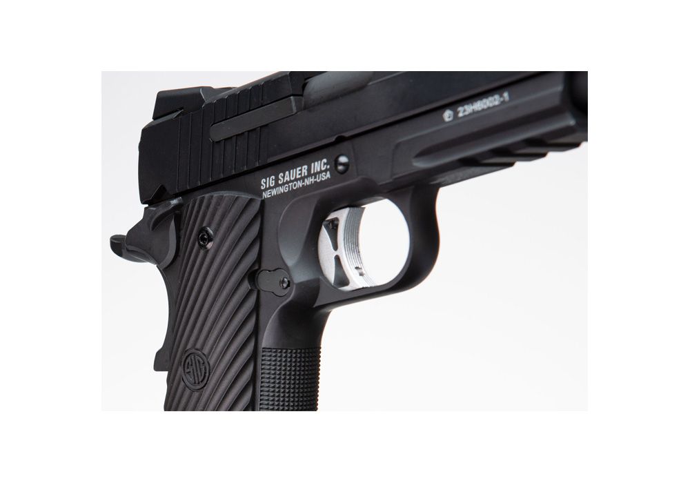 Introducing the SIG SAUER PROFORCE 1911 TACOPS, a CO2 powered semi-automatic airsoft pistol with exceptional detail and hard-hitting performance. With full metal construction and equipped with a full blowback action. Centerfire replicates, making it a superb airsoft sidearm as well as an excellent training tool. This 1911 features a M14x1 CCW threaded muzzle for attaching an airsoft tracer unit or other muzzle devices and includes a knurled thread protector to complete that tactical look. On its frame, you will find a Picatinny accessory rail for attaching weapon lights or lasers, and both the front strap and mainspring housing feature checkering for enhanced grip under slippery conditions. Other features include a skeletonized trigger and hammer, functional ambidextrous thumb safeties, and a functional grip safety. Equipped with an adjustable hop-up system, the PROFORCE 1911 TACOPS lets you fine-tune the trajectory of your shots. Its full-size, drop-free magazine houses the 12g CO2 cartridge and holds 14 rounds of airsoft ammunition. The high-pressure CO2 blowback mechanism adds a realistic recoil impulse to each shot, immersing you in the action and enhancing the overall shooting experience.