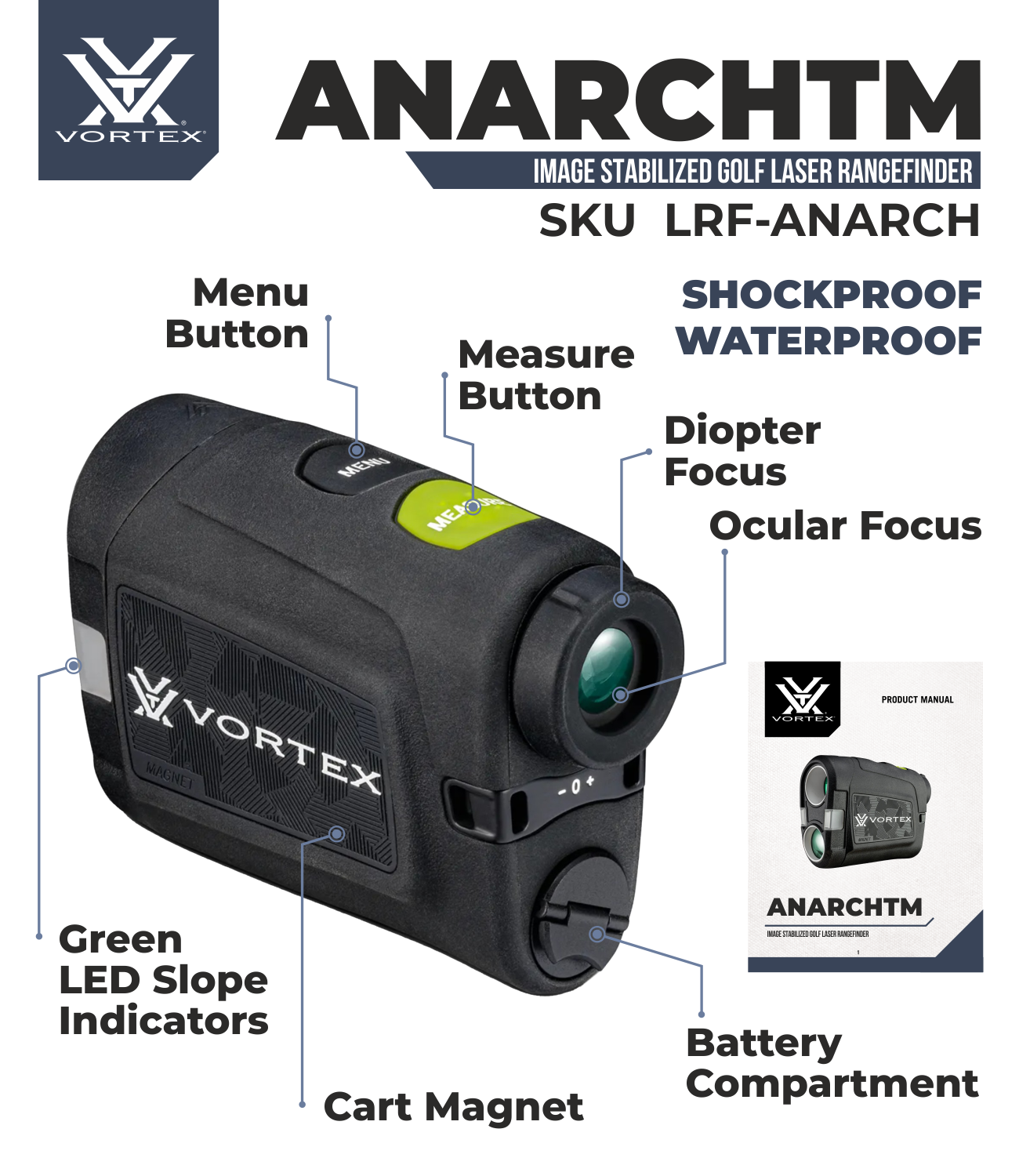 The tournament legal Anarch is loaded with features to give you an advantage on the course. Image stabilization provides a crisp sight picture making ranging easier. The illuminated, red display uses auto brightness to adjust to your environment, providing you clear range reads.