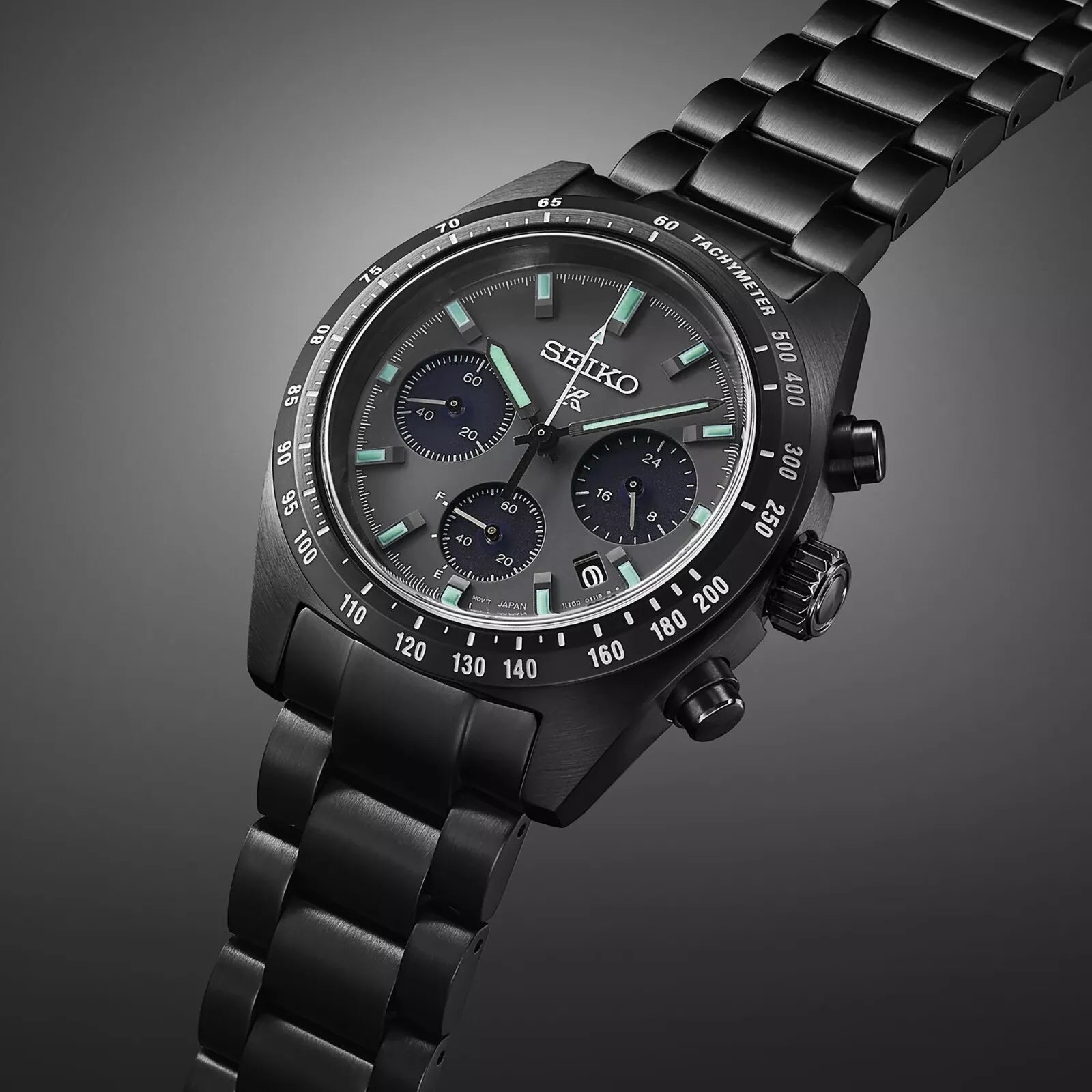 Prospex Black Series Speedtimer Solar Chronograph. Designed for those who treat life as the ultimate adventure, Seiko Prospex keeps moving forward, meeting every challenge with technological excellence and winning design. This dramatic watch is part of a high-intensity collection inspired by the 1969 “Speedtimer,” the world’s first self-winding chronograph, extending it to the Black Series. Featuring the newly developed “Green LumiBrite Pro,” developed for divers by combining the color most recognizable in the dark with a higher brightness and longer afterglow, this extraordinary timepiece provides a “night vision” for visibility in the dark similar to the view seen through a night scope. The chronograph function measures up to 60 minutes of elapsed time in 1/5-second increments and includes a split time function, while the solar cell, powered by any light source, with no battery change required, provides a 6-month power reserve when fully charged. The dark gray dial includes three black subdials, with a 24-hour indicator and power reserve indicator, as well as a date calendar and green LumiBrite on hands, markers and the tip of the chronograph hand. Crafted of stainless steel with black hard coating, curved anti-reflective sapphire crystal, black tachymeter bezel, secure screwdown caseback and tapered three-link bracelet with tri-fold push button release clasp. 10 bar, 100M Water Resistant