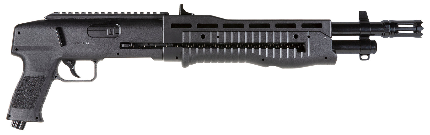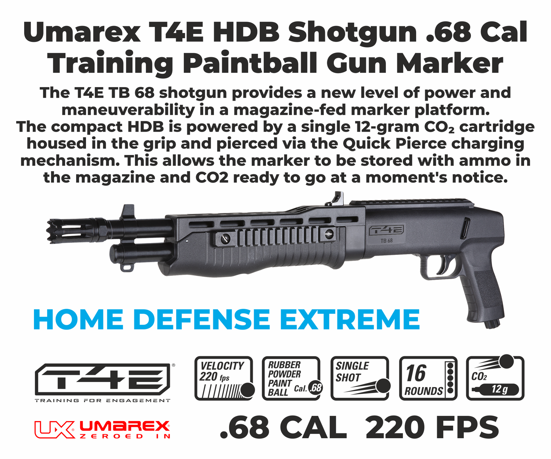 The T4E TB 68 Paintball Marker provides a new level of power and maneuverability in a magazine-fed marker platform. The compact HDB is powered by a single 12-gram CO2 cartridge housed in the grip and pierced via the Quick Pierce charging mechanism. This allows the Paintball Marker to be stored with ammo in the magazine and CO2 ready to go at a moment's notice. The internal magazine holds 16 rounds of .68 caliber rubber, paint, or dust ball ammo. The .68 caliber projectiles will travel at 220 FPS and the CO2 cartridge will effectively launch all 16 projectiles before it needs to be changed.