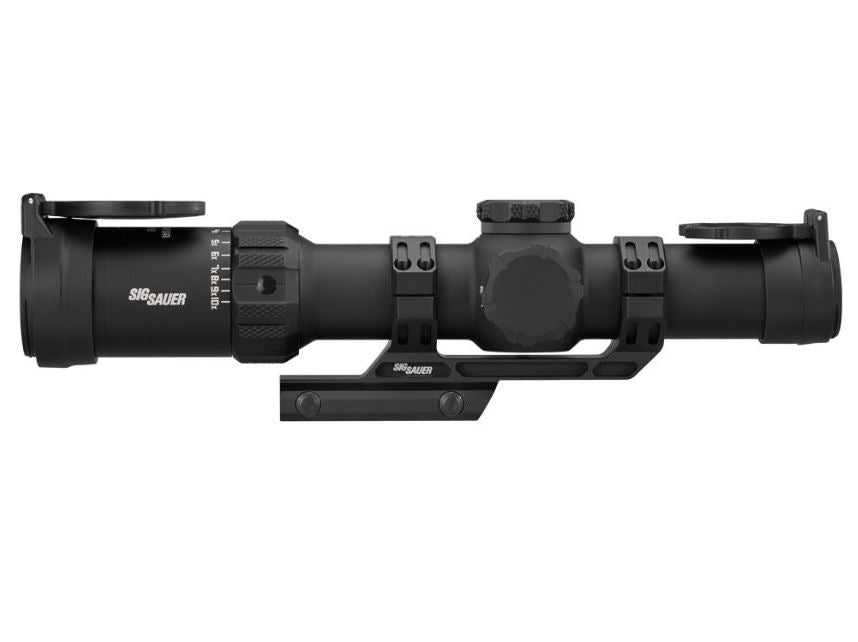 Experience exceptional optical performance and impressive light transmission with the SIG SAUER TANGO-MSR LPVO, designed to deliver clarity and versatility across a wide range of viewing conditions. The high-performance optical system utilizes low-dispersion glass to provide crisp, clear visuals. An integrated threaded throw lever allows for fast and smooth magnification adjustments. The illuminated MSR BDC reticle with 11 brightness settings supports clear alignment in varying lighting environments. For added convenience, lay-flat flip-back lens covers are included to help protect the optics when not in use. Built for reliability, this LPVO is waterproof, impact-resistant, and fog-proof for dependable performance in challenging conditions. The package also includes an ALPHA-MSR one-piece aluminum cantilever mount for easy and secure installation.