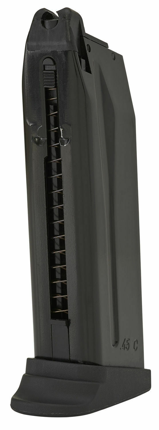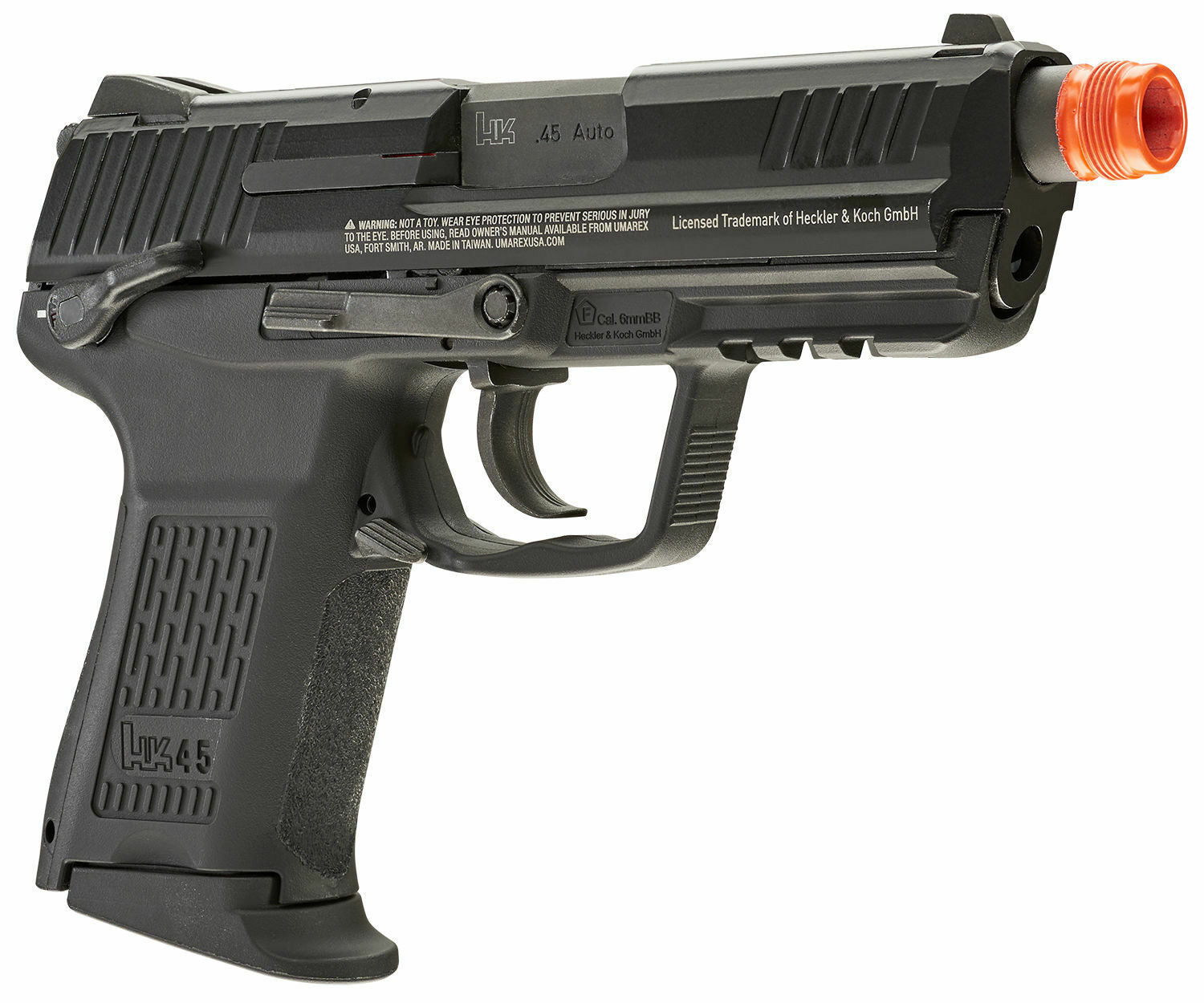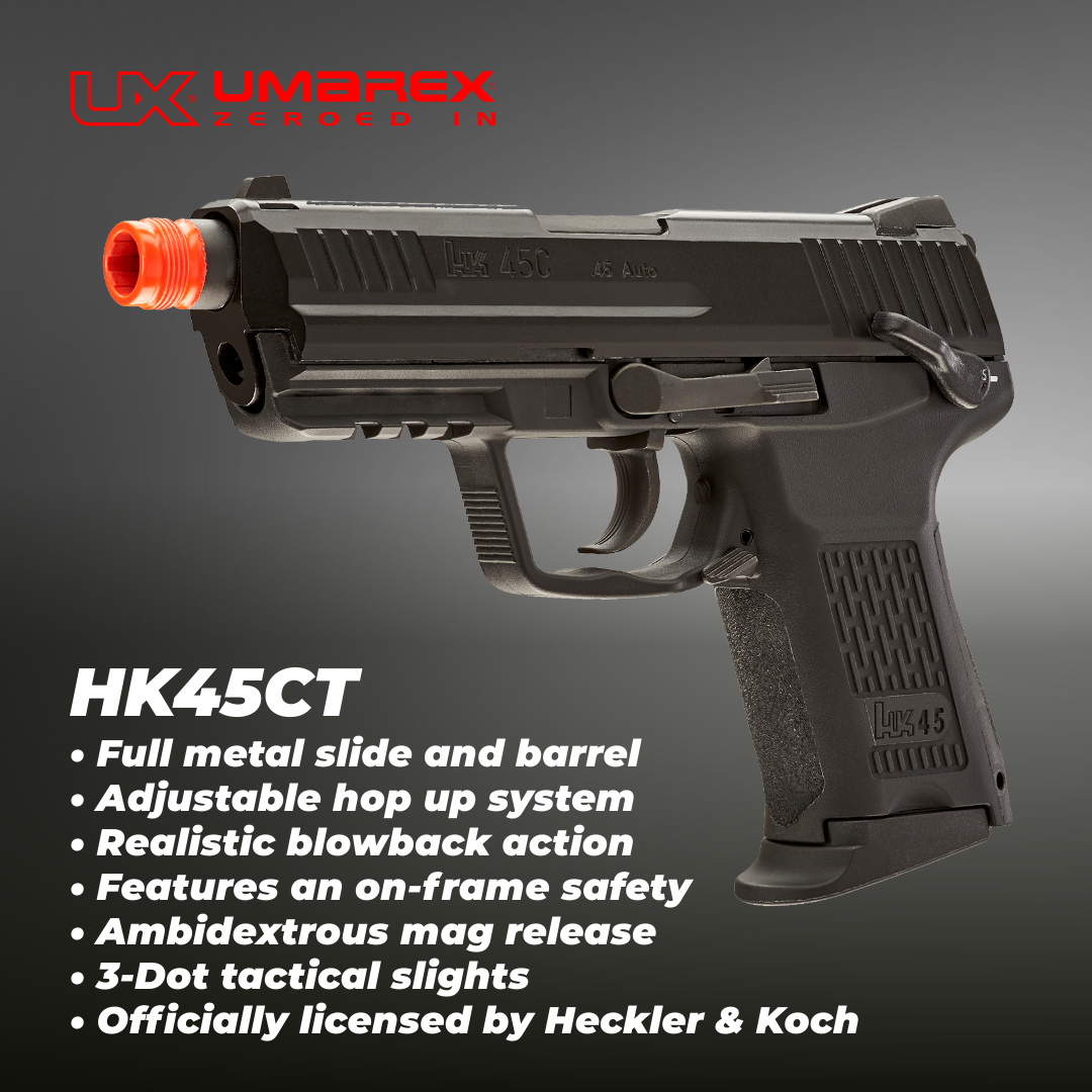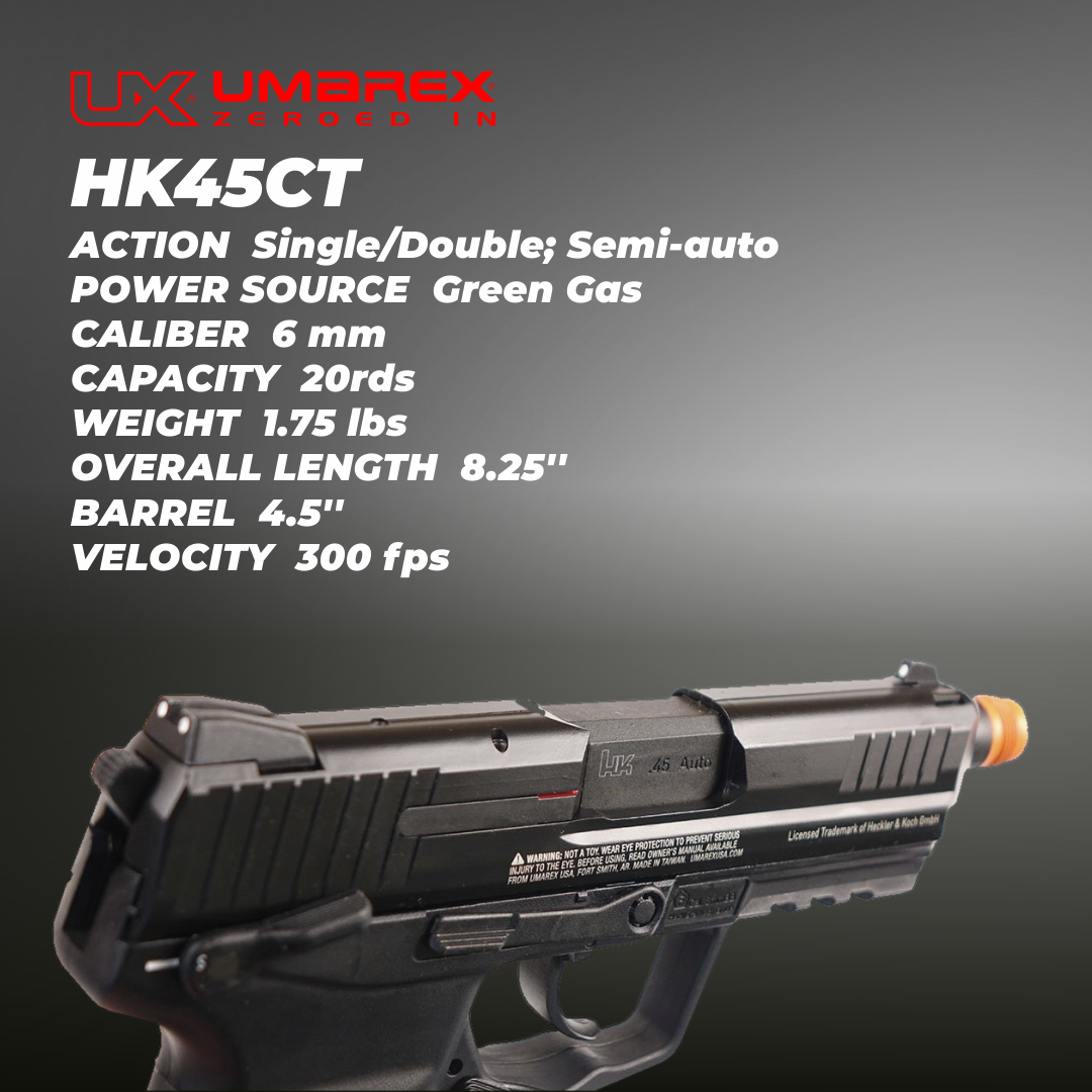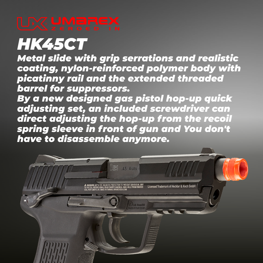 HK45CT is a perfect replica in process and material. with every appearance parts and all details like coating, surface finishing, anti-skid textured surface, realistic firing pin and loaded-chamber indicator were base on real. All the feature of original design, include polygonal barrel and ergonomic, anti-skid, ambidextrous use and all control system, enjoy the reliable action control. Metal slide with grip serrations and realistic coating, nylon-reinforced polymer body with picatinny rail and the extended threaded barrel for suppressors. By a new designed gas pistol hop-up quick adjusting set, an included screwdriver can direct adjusting the hop-up from the recoil spring sleeve in front of gun and You don't have to disassemble anymore.