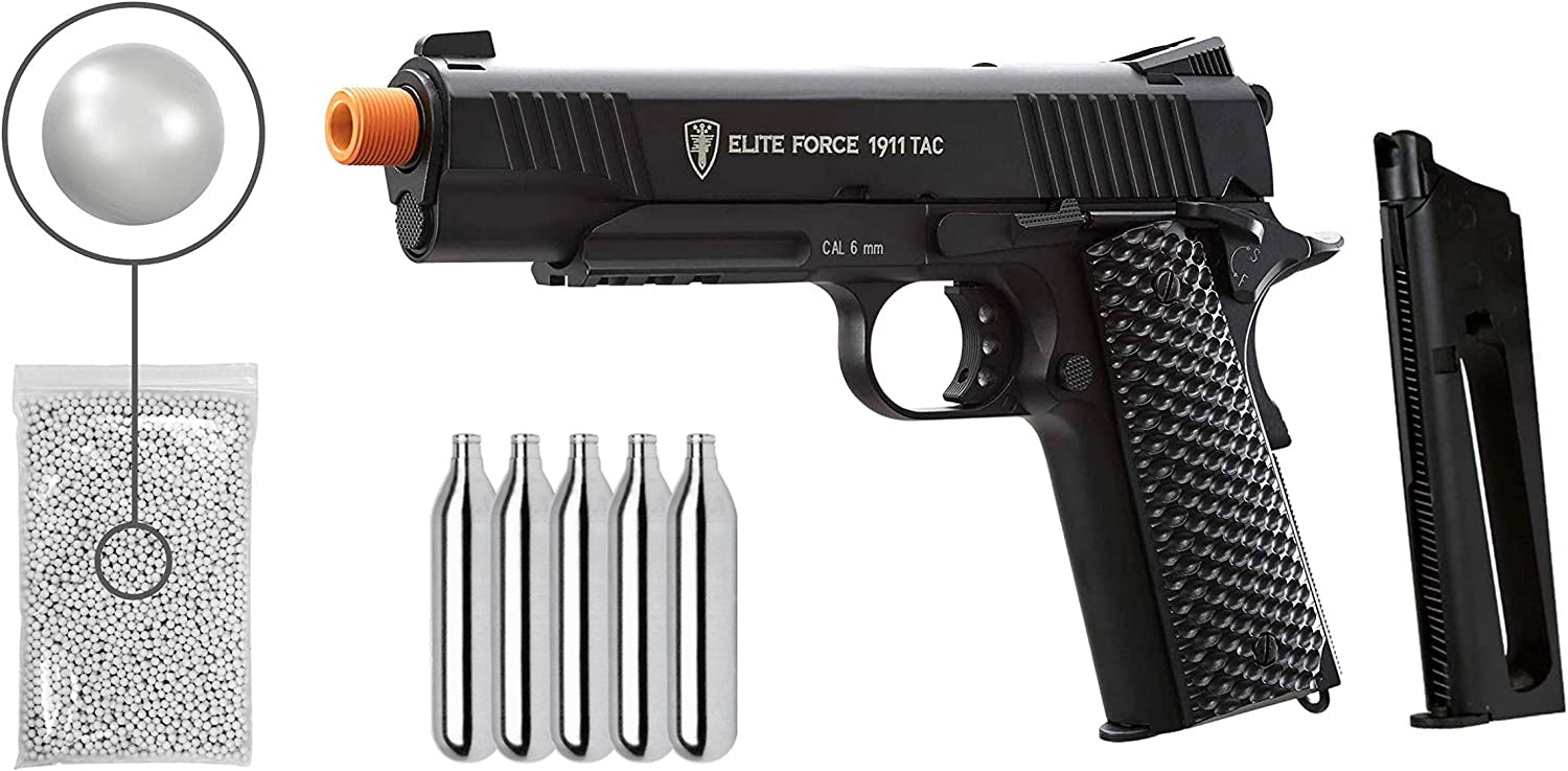 The Elite Force 1911 Tac Airsoft pistol comes with everything needed and more when you are looking to upgrade from a standard 1911. Elite Force 1911 TAC Gen3 Airsoft Pistol also comes in a custom Black color configuration to make it stand out in a sea of CO2 blowback pistols. The magazine of the Airsoft gun is updated and lets you pour the BBs in the magazine chamber instead of loading them one by one. The Elite Force 1911A1 features a full metal body with black plastic grips, and a shot velocity of 345 fps (using .20g BBs). The adjustable hop-up unit lets you dial in impressive accuracy. This Airsoft pistol is capable of outstanding blowback recoil & accuracy.