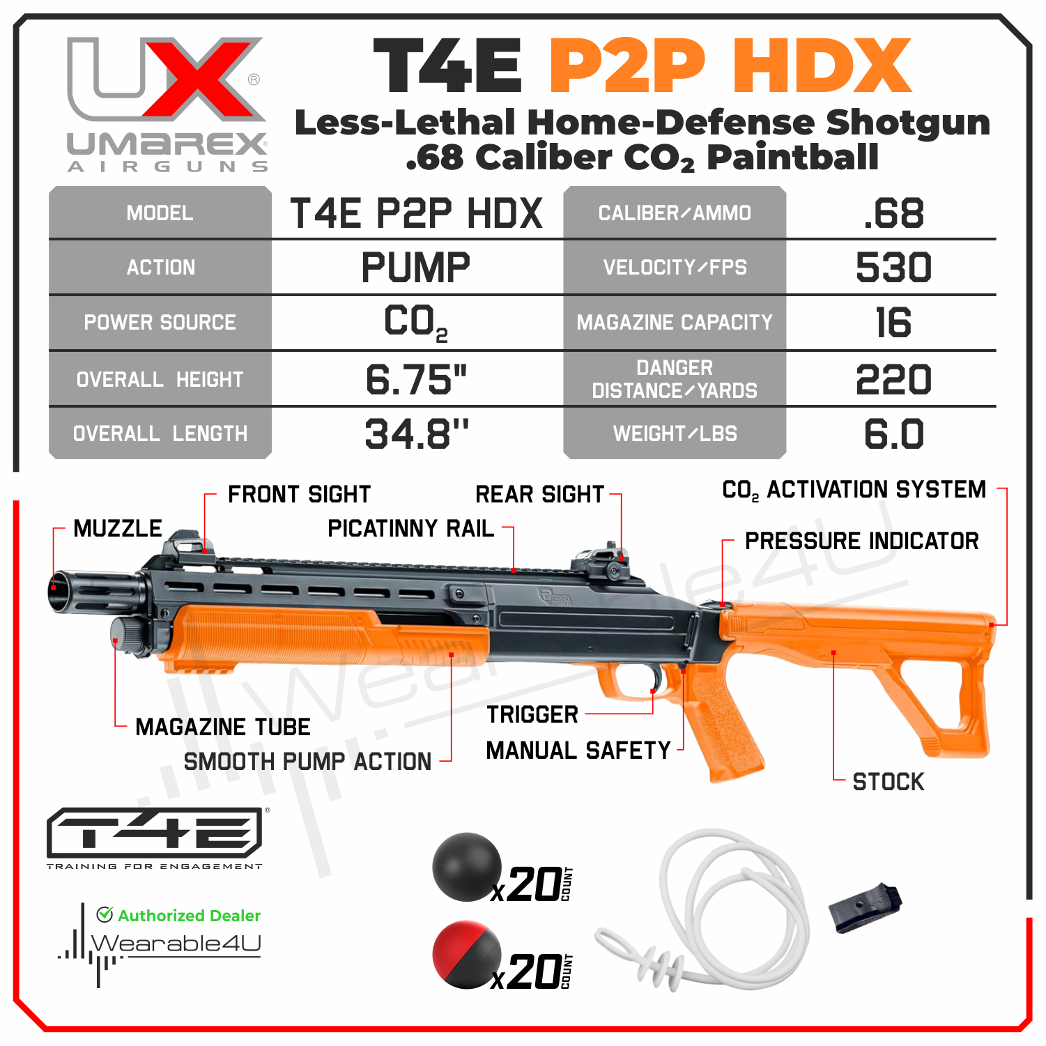 Umarex T4E by P2P HDX Less-Lethal Home Defense Shotgun .68 Caliber CO2 Training Paintball Shotgun BLK/Orange (2292306) Specifications: