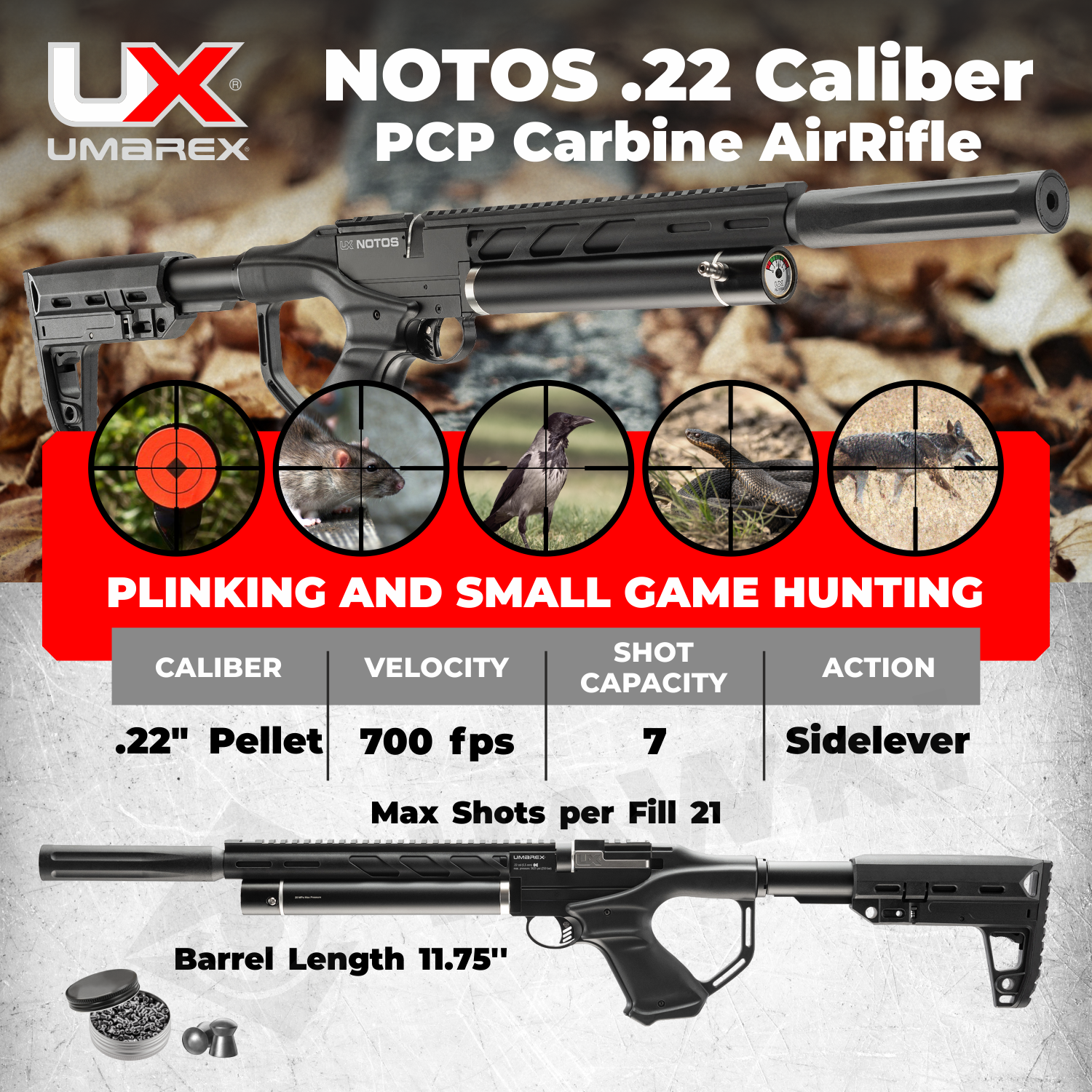 In The Box: Umarex Notos PCP .22 Caliber Pellet Carbine Air Rifle (2254847) with Pack of 250x .22 Cal Pellets and Extra Mag Bundle