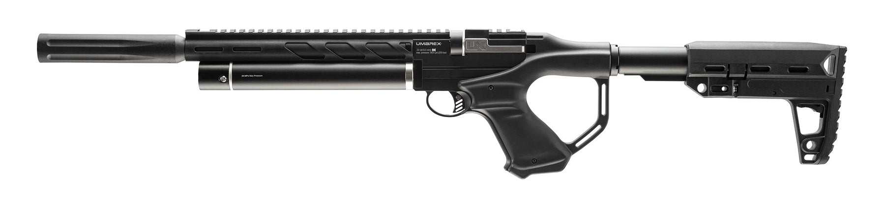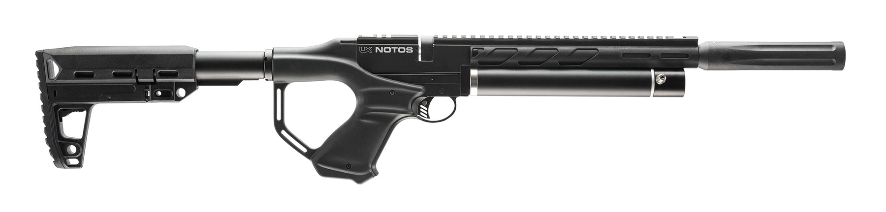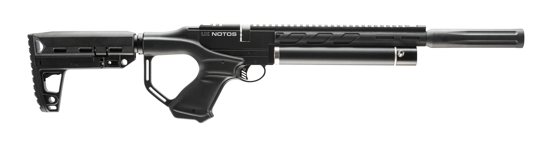 The Umarex Notos .22 caliber PCP Carbine Air rifle is the surprising compact PCP pellet pusher that is making a buzz in the red hot PCP airgunning world. The Notos delivers impressive power from its short 11.75-inch barrel launching a 12 grain .22 caliber pellet at 700 fps. With its 7-Shot auto-indexing rotary magazine, the quiet shooting side lever cocking Notos Air Rifle is easy to shoot and allows the shooter to smoothly transition to the next shot! This PCP Air Rifle's fixed high-pressure air tank fills to a maximum pressure of 3,625 psi and is regulated for consistent shot-to-shot performance to 1,900 psi.