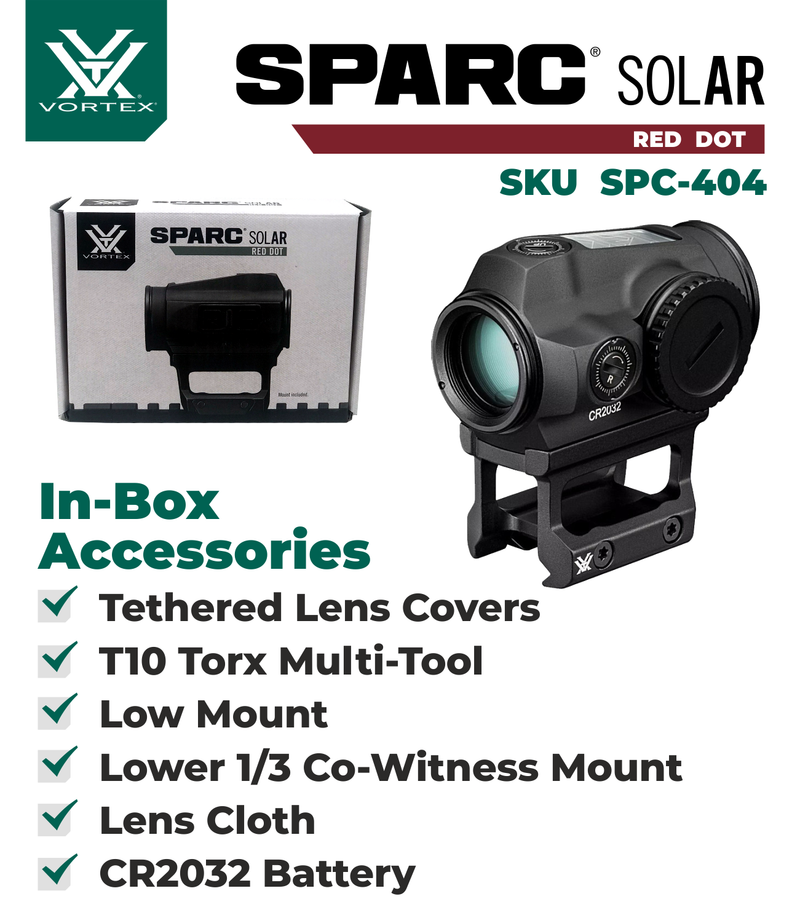{ "@context": "https://schema.org/", "@type": "Product", "name": "Vortex Optics SPARC Fully Multi-Coated Solar Red Dot Sight, 2 MOA Dot with Vortex Optics Free Hat, Black Camo Bundle", "image": "//www.sports-and-gadgets.com/cdn/shop/products/SPC-404_121-53-BCA_small.png?v=1635939710", "description": "The SPARC SOLAR harnesses the power of the sun for up to 150,000 hours of battery life. Auto D-TEC technology automatically switches from solar to battery power when the sun can’t power the dot to your choice of 10 daytime illumination settings and two night-vision compatible settings. Its daylight bright, 2 MOA dot delivers a clear, precise point of aim, and is motion activation capable for worry-free activation in high stress. situations. Automatically switches from solar to battery power. Automatically activates with motion after auto shut-off.