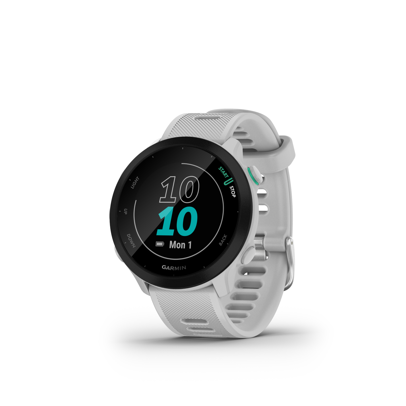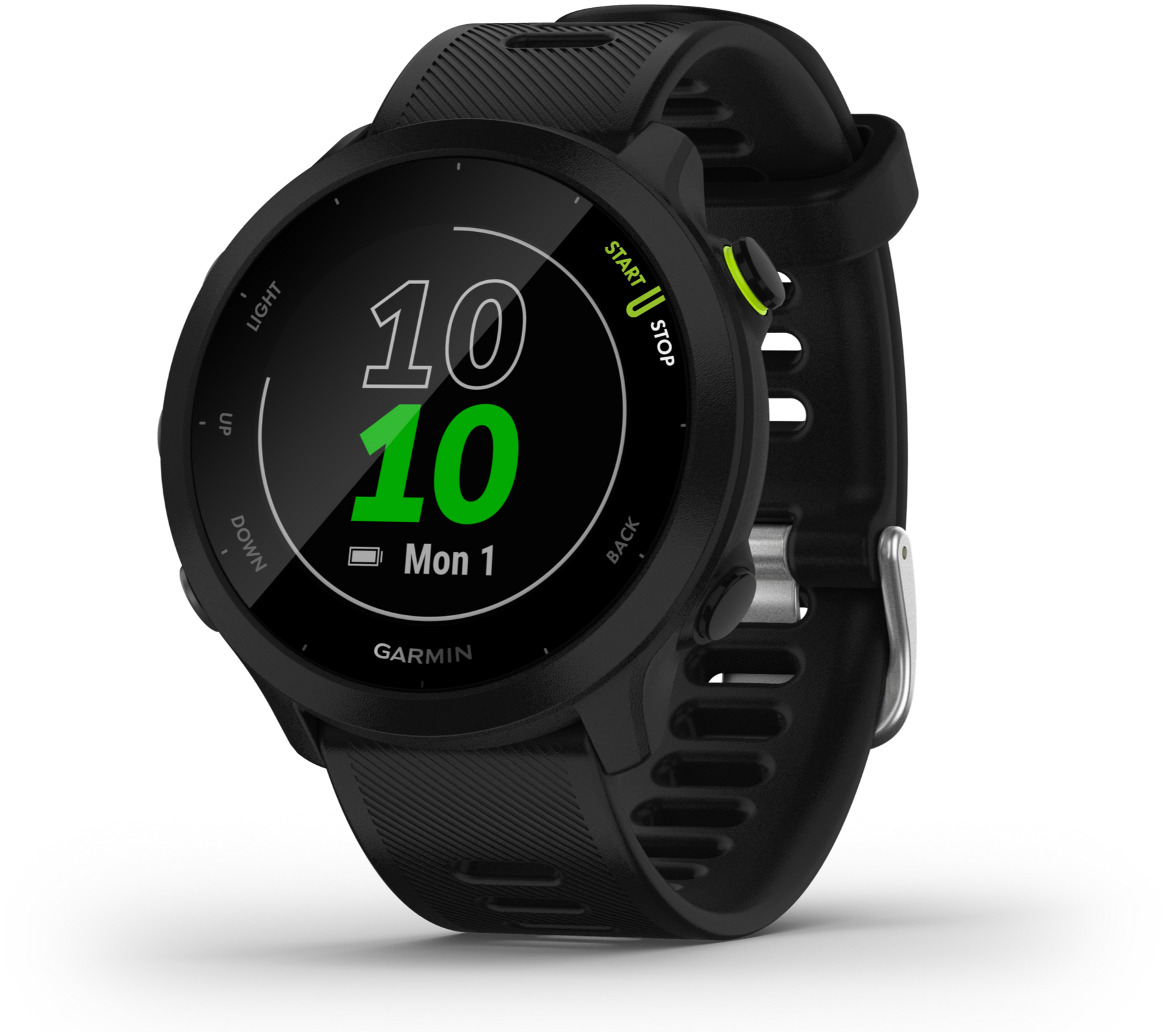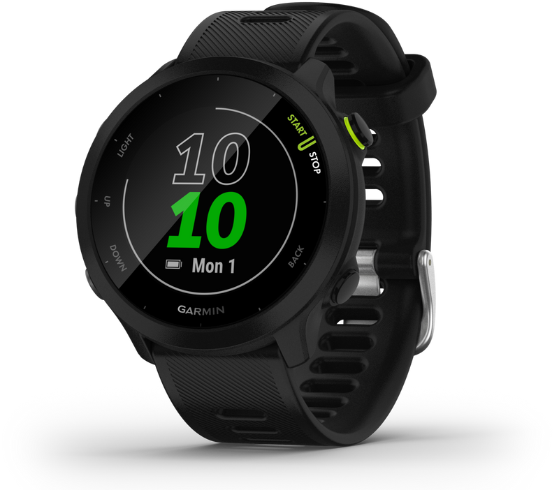 See yourself as a runner. Forerunner 55 is the GPS running smartwatch that goes beyond pace and heart rate (this is not a medical device) stats. Take the guesswork out of training with personalized guidance and daily suggested workouts based on your training history and fitness level. Change things up with HIIT and breathwork activity profiles. Advanced wellness tracking features, such as all-day respiration monitoring, intensity minutes and more, put you in tune with your body. Get more runs in between charges, thanks to this watch’s long battery life, and make it truly your own by downloading watch faces, apps and more from the Connect IQ Store (requires Garmin Connect app and Connect IQ app loaded on a compatible smartphone).