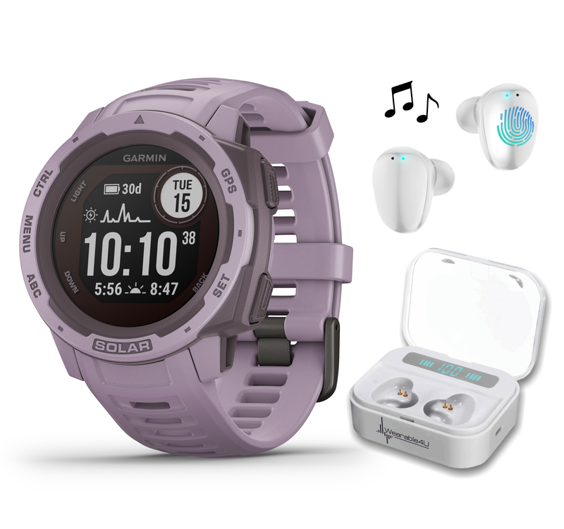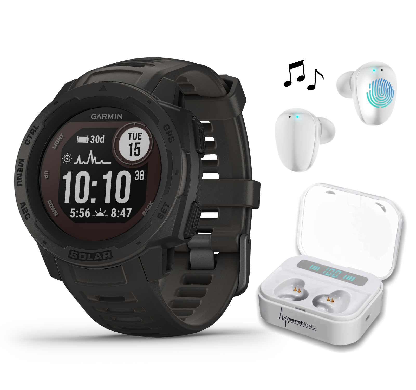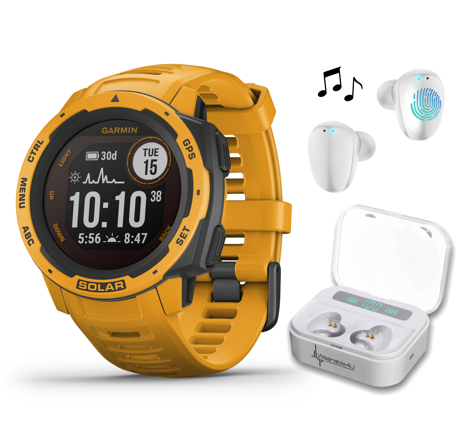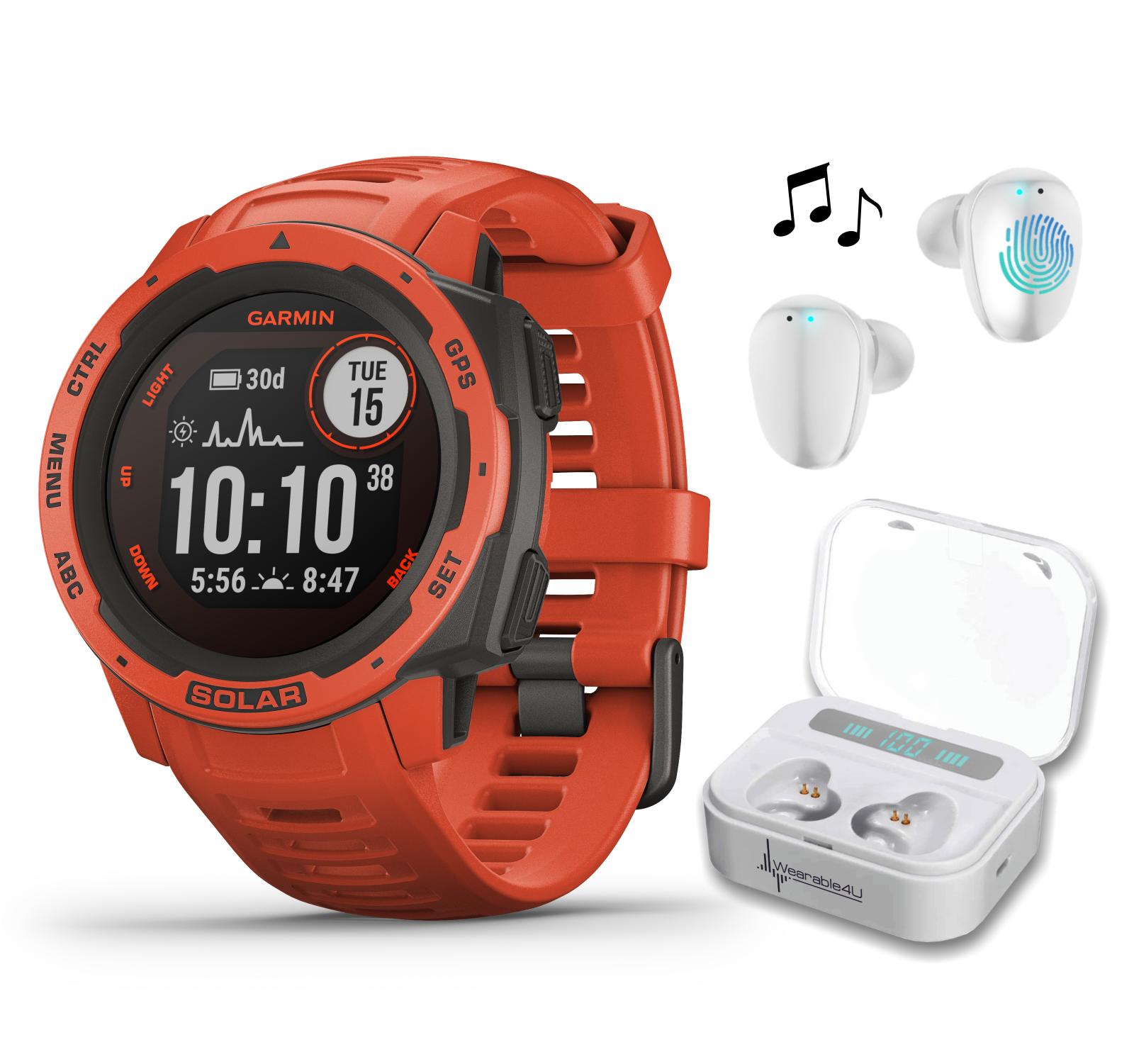 - [IN THE BOX] - 1 x Instinct Solar, Flame Red, 1 x Charging/data cable, 1x Wearable4U 2 in 1 Black EarBuds + Power Pack OR Wearable4U Compact Power Bank (1x)