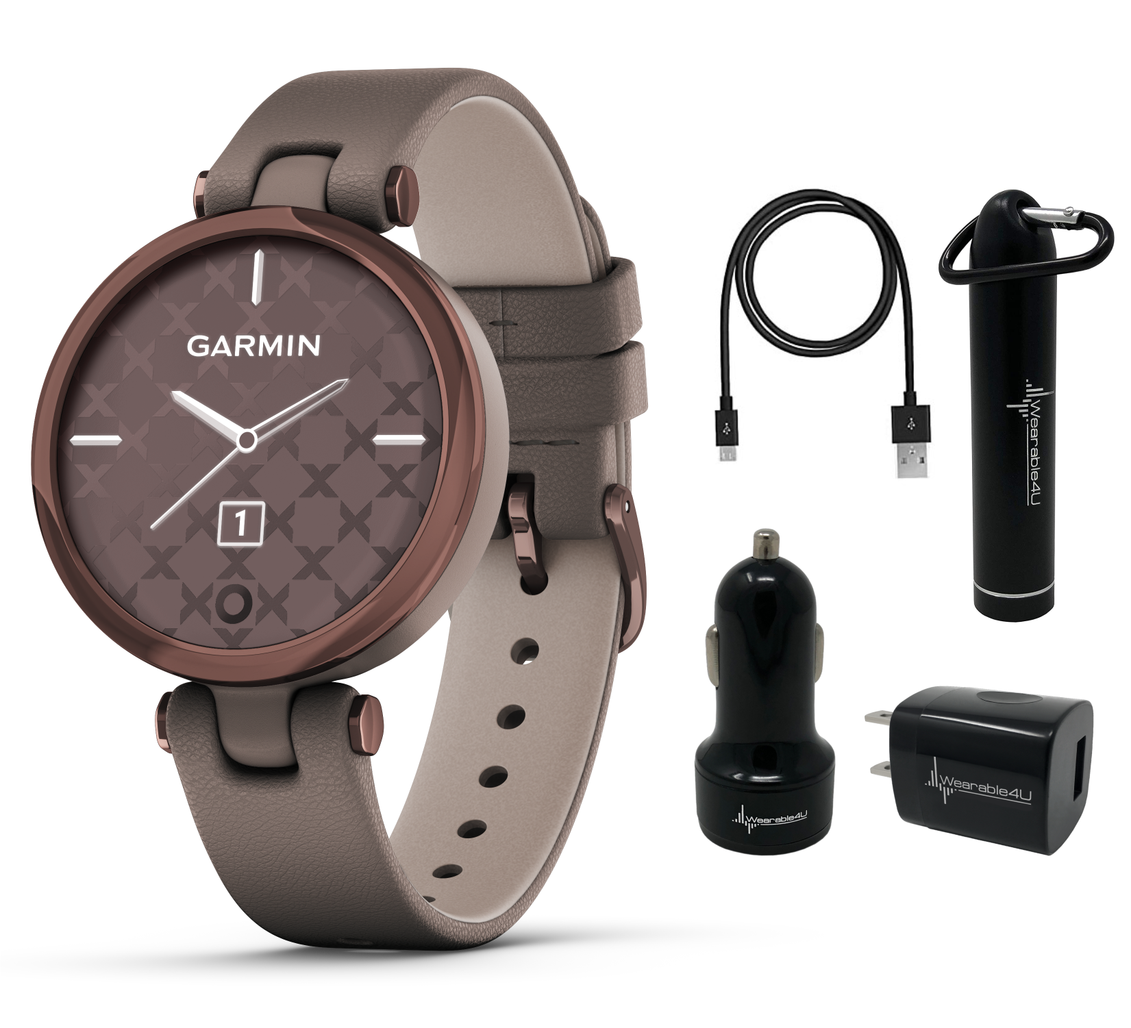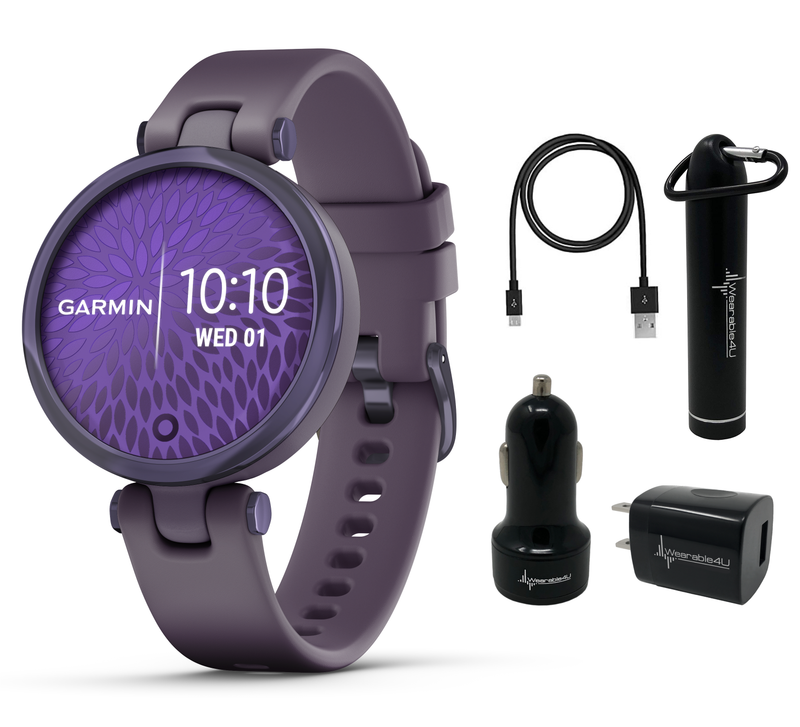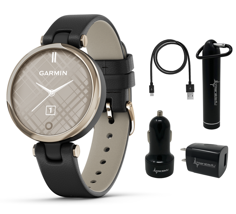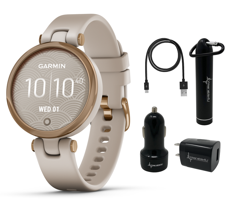 IN THE BOX: 1 x Garmin Lily - Sport Edition, 1 x Charging/Data Cable, 1 x Wearable4U Ultimate Power Pack that contains Wearable4U Power Bank 2200 mAh, Wearable4U Wall and Car USB Charging adapters