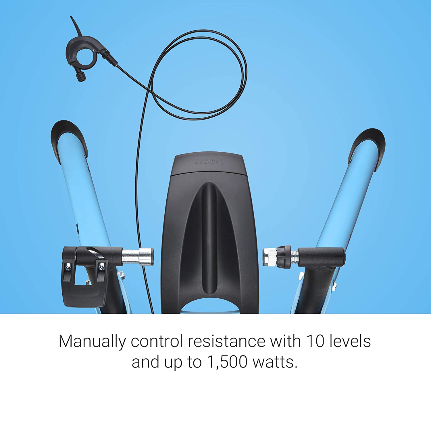 This indoor trainer has a small footprint, 675 x 650 mm (26.6” x 25.6”), but provides a sturdy ride.