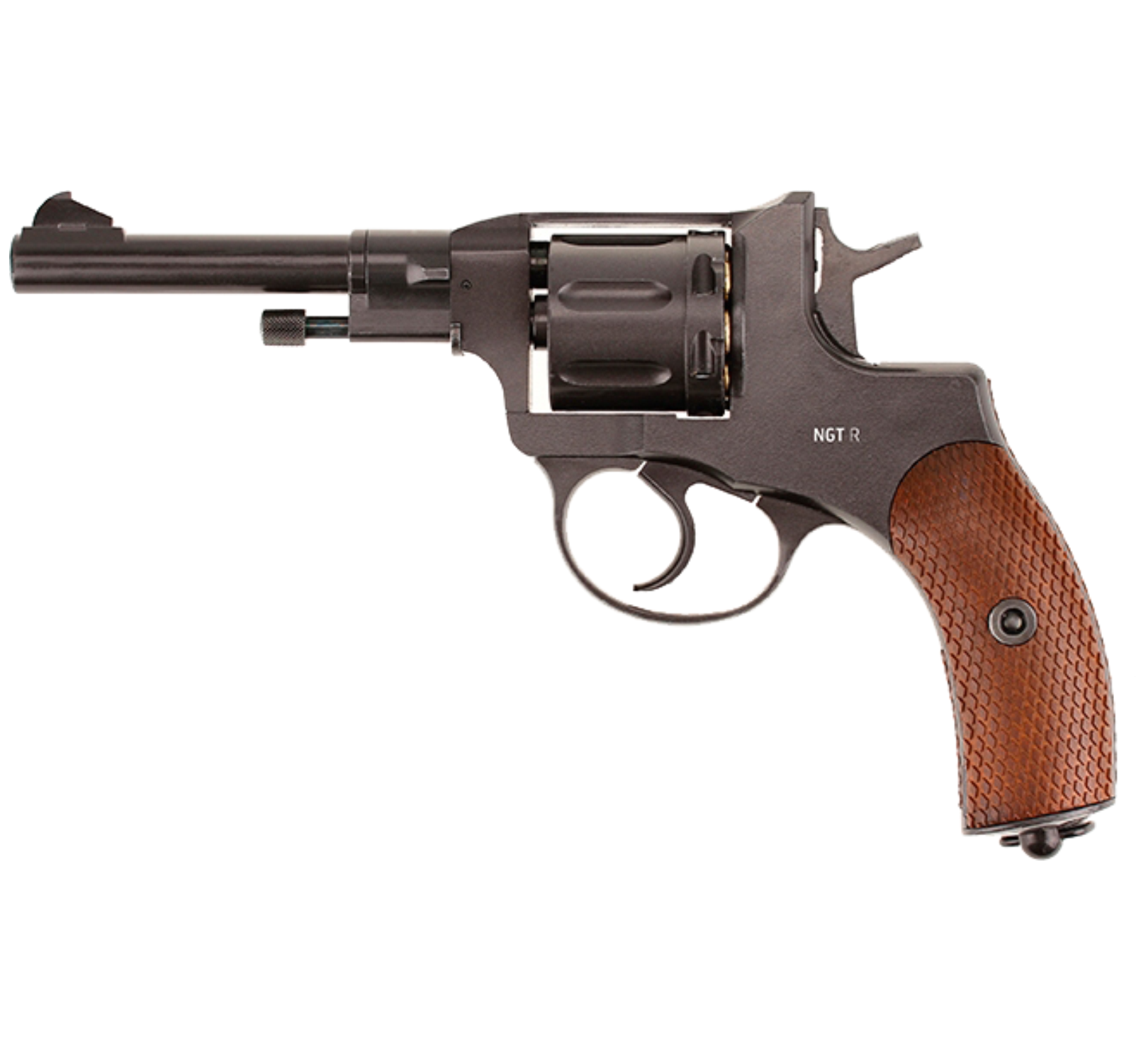 The Gletcher version was included in the “Russian Legends” series of air guns. This seven-shot revolver featured a unique cylinder that is reloaded one bullet at a time through a loading gate. Version of the Gletcher NGT RF revolver with safety lever.