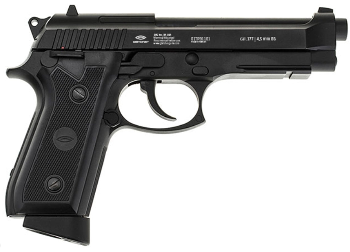 CO2 powered air pistols will fire due to the discharge of pressurized carbon dioxide in a special tank. Gletcher uses 12-gram CO2 cartridges (Not Included).