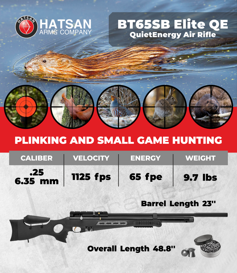 View moreAn excellent rifle for hunting or plinking, the Hatsan BT65 SB Elite QE delivers significant knockdown power no matter which caliber you choose. If you plan to hunt for medium-size game such as beavers, woodchucks, muskrats or nutria, choose the .177, .22 or .25 caliber.