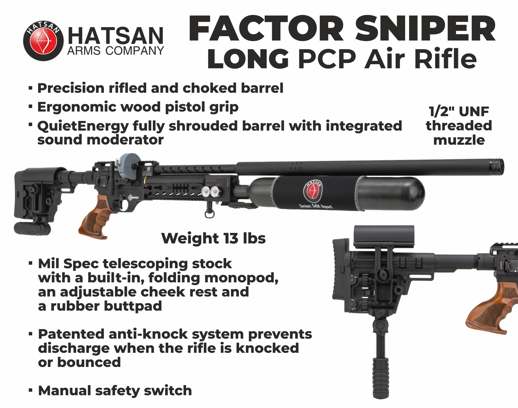 Embark on a new era of air rifle excellence with HatsanUSA’s unveiling of the Factor Sniper Long. This long-range competition PCP rifle is meticulously crafted to redefine the standards of precision, power, and customization within the industry. Boasting a manual loading system, side-lever action, and pre-charged pneumatic (PCP) technology, the Factor Sniper Long offers a seamless and precise shooting experience. This air rifle caters to a diverse range of shooting preferences.