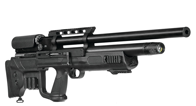 The Gladius Airgun is an all-around great airgun for everything from plinking to varmint hunting. It sports a customizable bullpup design with an ambidextrous stock constructed of advanced, weather-resistant polymer. The stock has an elevation adjustable comb and an adjustable buttpad providing a comfortable shot every time. You'll love the convenient storage of up to 3 additional rotary magazines built right into the stock, and the side-lever action offers quick and easy follow-up shots when you need them. The safety is automatic upon cocking, and can also be applied manually.