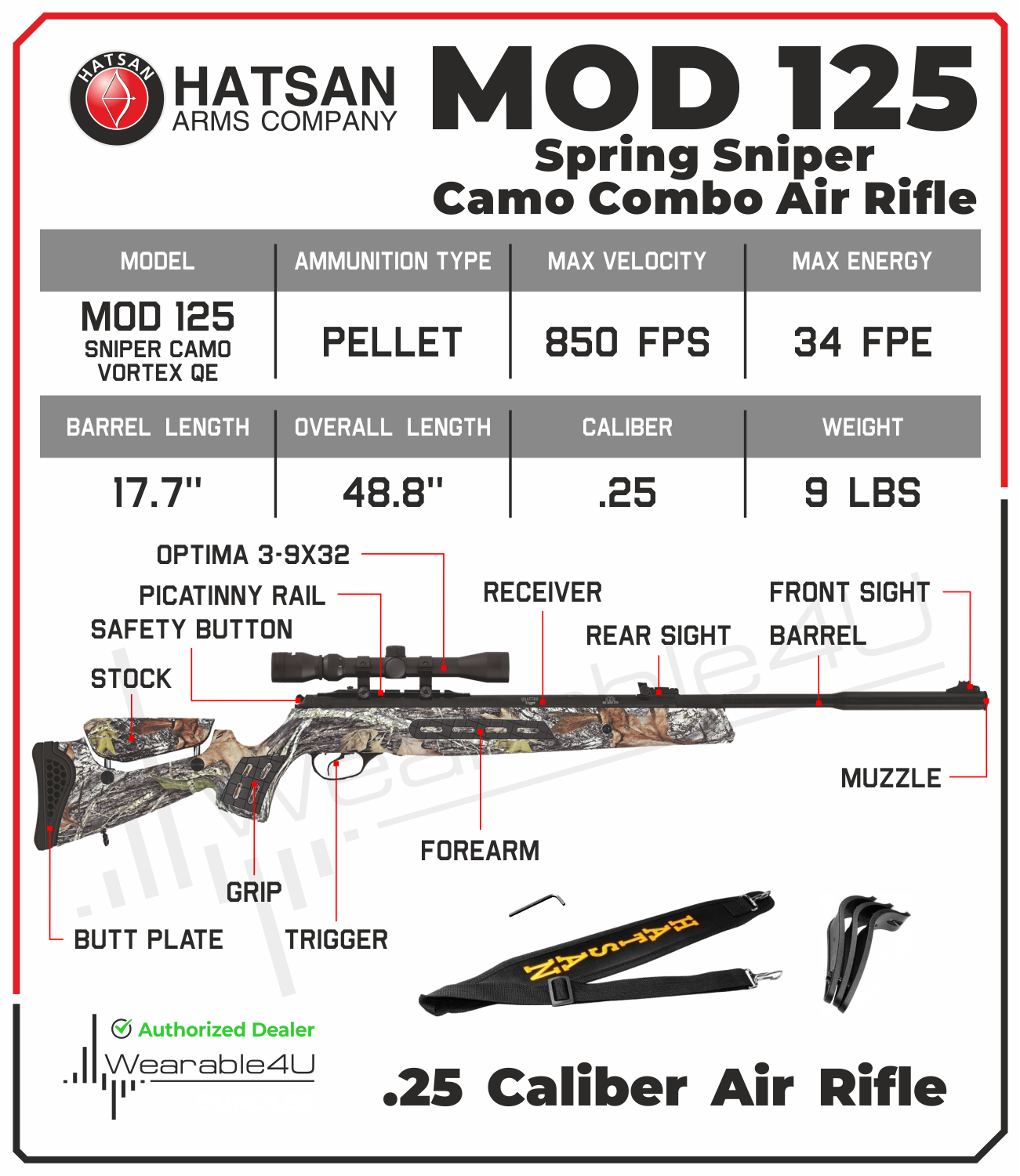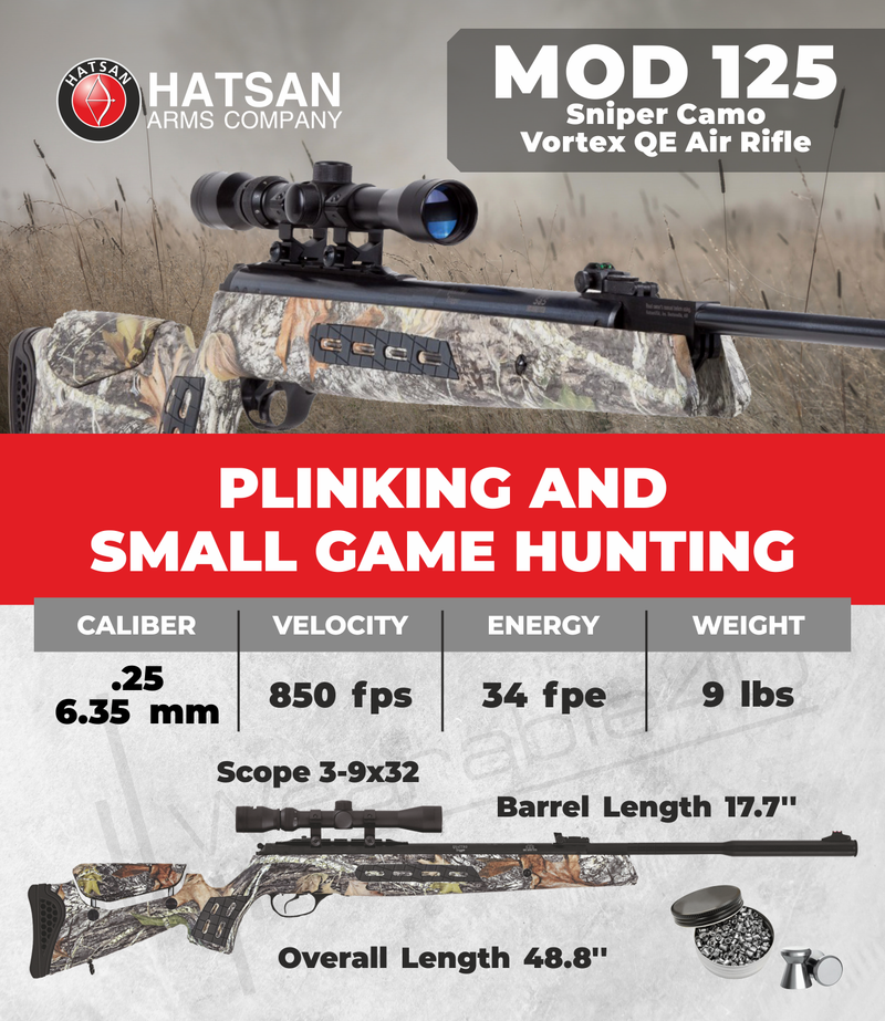 Hatsan Mod 125 Sniper Camo Vortex QE Break Barrel Air Rifle .177 Cal / .22 Cal / .25 Cal Specifications: