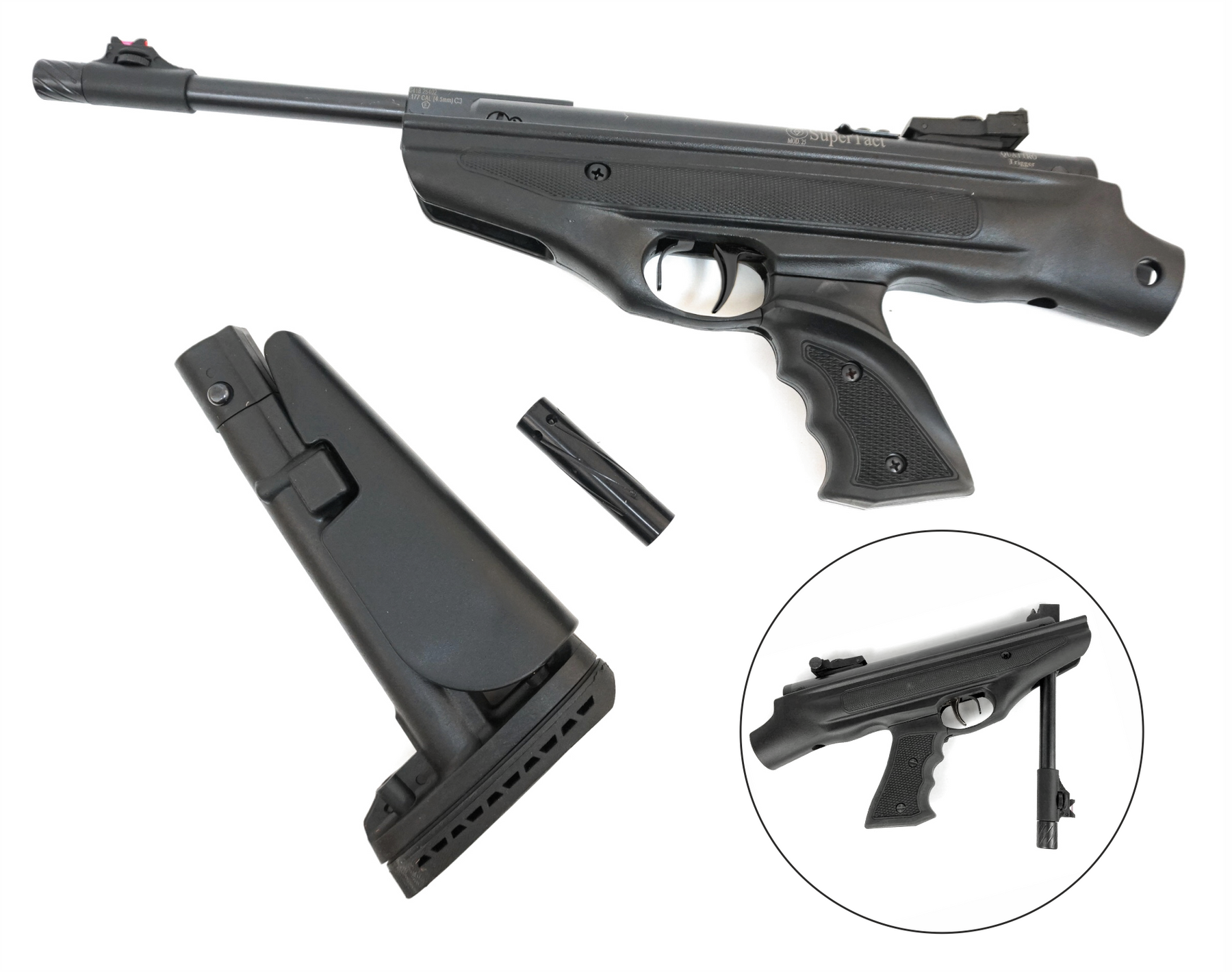 With the removable buttstock, you can shoot this air gun as a compact Airrifle or as a Airpistol. No matter what your situation calls for, the Hatsan 25 SuperTact rises to the occasion. A cocking aid is included. Remove the muzzle cap and screw on the cocking aid for additional cocking leverage.
