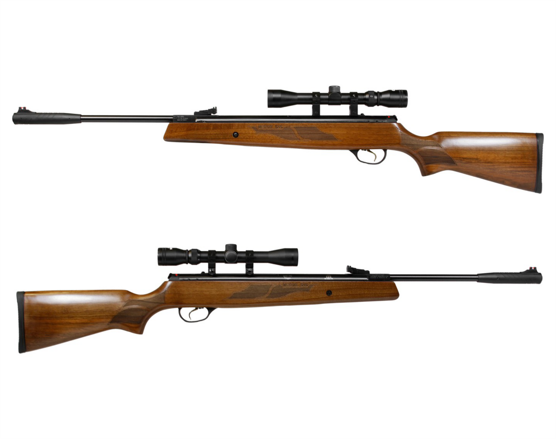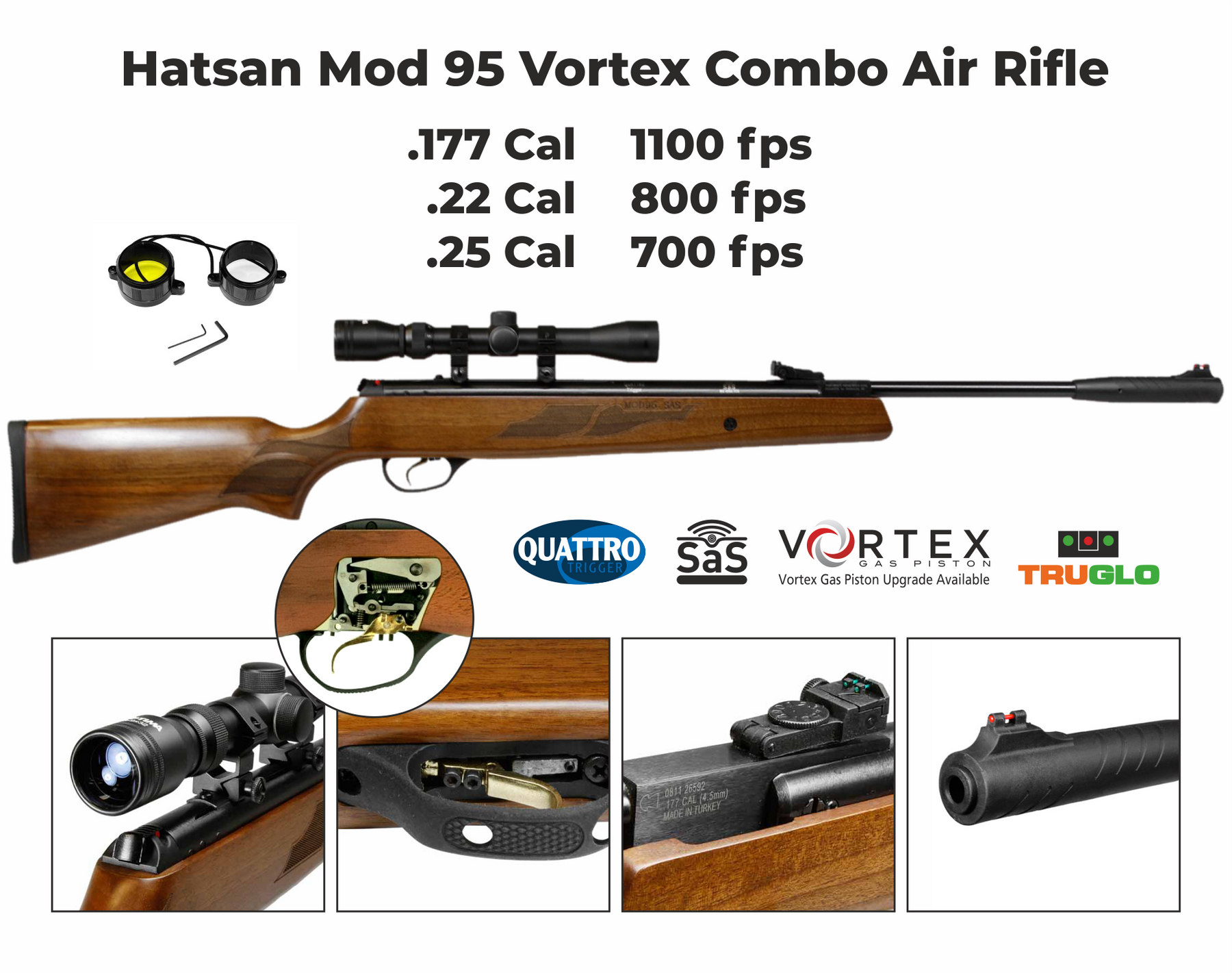 Genuine Turkish Walnut Stock. Break barrel single-shot air rifle. Vortex gas piston provides smoother shot cycle and eliminates spring fatigue. Precision rifled steel barrel with integrated muzzle brake. TruGlo fiber optic open sights with fully-adjustable rear sight. 11mm dovetail optic grooves machined into the cylinder. Automatic safety and anti-bear trap mechanism for safe operation. With its precision-rifled barrel, 2-stage adjustable Quattro Trigger, and shock absorbing features, the Model 95 Vortex will put pellets on target with great precision.