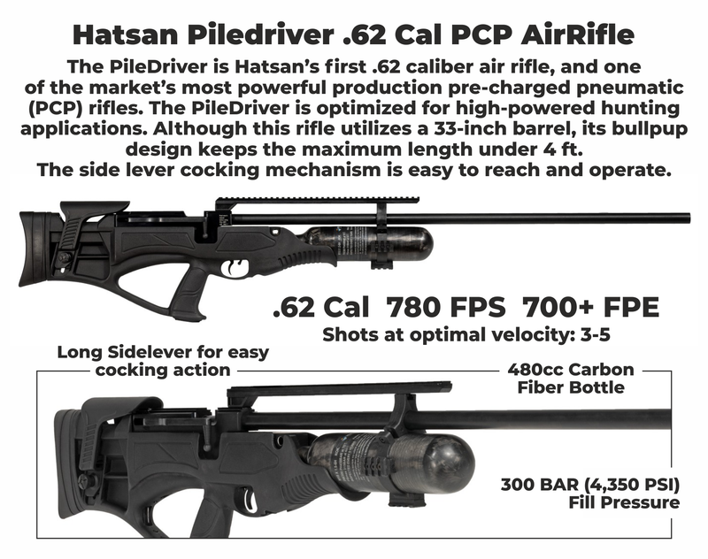 The PileDriver is Hatsan’s first .62 caliber air rifle, and one of the market’s most powerful production pre-charged pneumatic (PCP) rifles. The PileDriver is optimized for high-powered hunting applications. Capable of producing over 800 ft-lbs. of energy in .50 caliber, it is also available in a 700+ FPE-generating .62 and .45 caliber models. Although this rifle utilizes a 33-inch barrel, its bullpup design keeps the maximum length under 4 ft. The side lever cocking mechanism is easy to reach and operate. A 480cc carbon fiber cylinder fills to 300 BAR (4350 PSI) and will provide up to 6 high-powered shots on a single fill. Which can easily be refilled with one of our TactAir pumps or compressors. The PileDriver’s unique, patented hammer design eliminates traditional steel coil springs in favor of a smoother, easier-to-cock, gas piston mechanism. This top-loading single-shot rifle also features an extra-large loading port that will accommodate ammo up to 34mm in length. The all-weather synthetic bullpup stock features an ergonomic pistol grip with textured grip surfaces for enhanced feel and control. The soft rubber butt pad is both elevation and angle adjustable to ensure controlled recoil and a comfortable fit. An elevation adjustable cheek rest ensures proper sight alignment with any optic. The rifle’s 14-inch-long scope rail is cut to accept both Picatinny and 11mm Dovetail mounts, offering plenty of real estate for a wide variety of optics.ble, the Piledriver is sure to be precise enough to place your shots with ease.