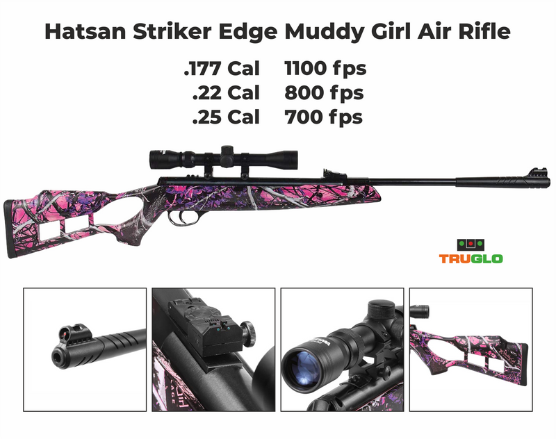 The Edge Spring Muddy Girl Combo Air Rifle with a Muddy Girl Camo Advanced Polymer Stock. Hatsan air rifles have gained a reputation for delivering exactly what the manufacturer promised. Whether you hunt or just like to plink-the Hatsan Edge will perform well. Large muzzle brake for easy cocking, with hooded TruGlo fiber optic front sight Includes 3-9x32 Optima scope and mount.